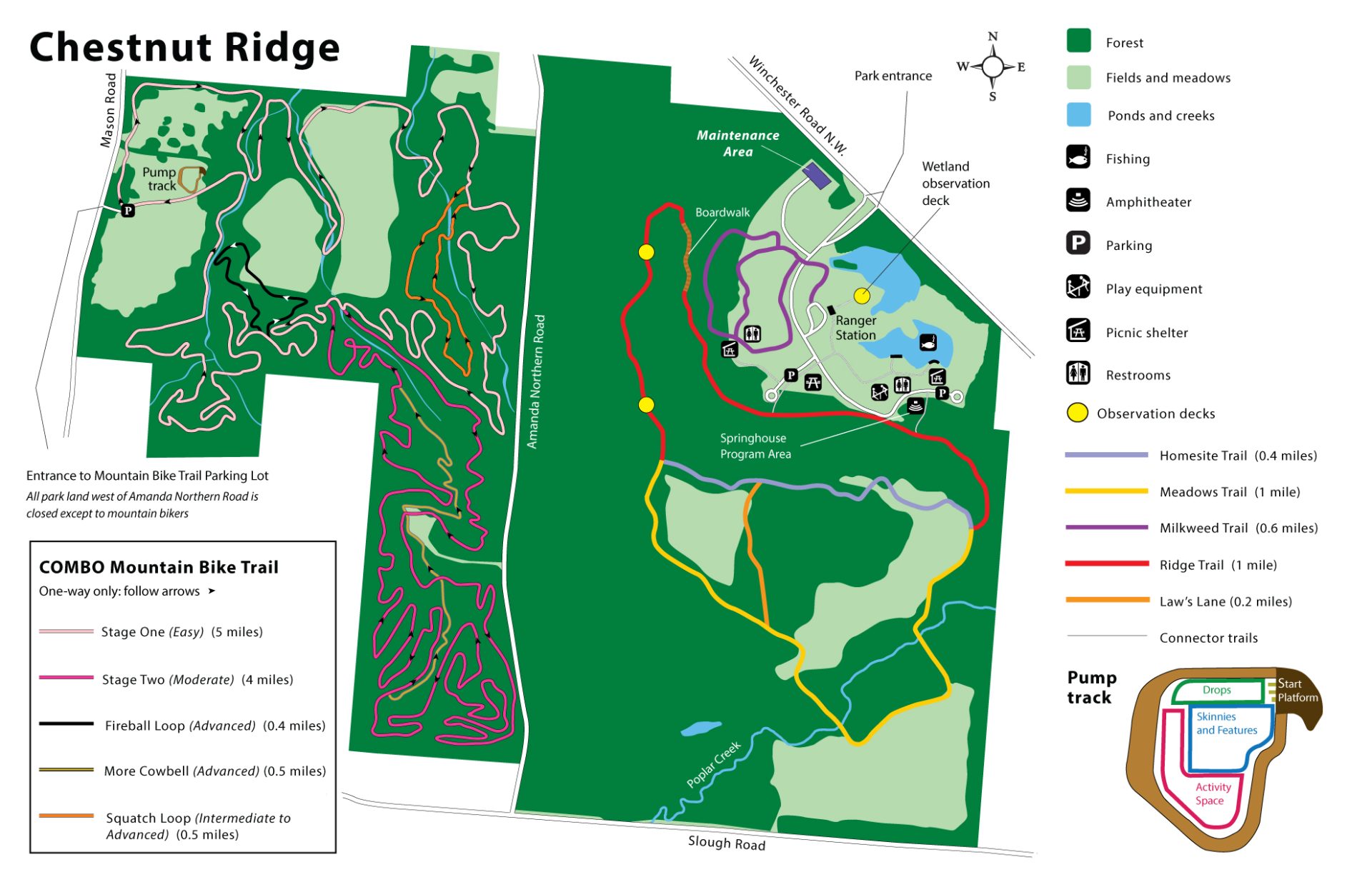 The 10.5-mile Mountain Bike Trail (for mountain biking only) goes through the woods and provides a terrific workout for mountain bike enthusiasts of all abilities. The 12- to 18-inch-wide trail is on an all-natural surface and features a 230-foot change in elevation. The trail was designed and built by volunteers with the Central Ohio Mountain Bike Organization (COMBO).