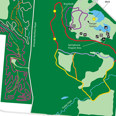Features steep climbs and descents through deep woods. The 12- to 18-inch-wide trail has a narrow creek bridge, banked turns, and a couple of short sections of sandstone cobble. A 5-mile inner loop is the beginner/intermediate trail and the outer loop is the advanced trail.