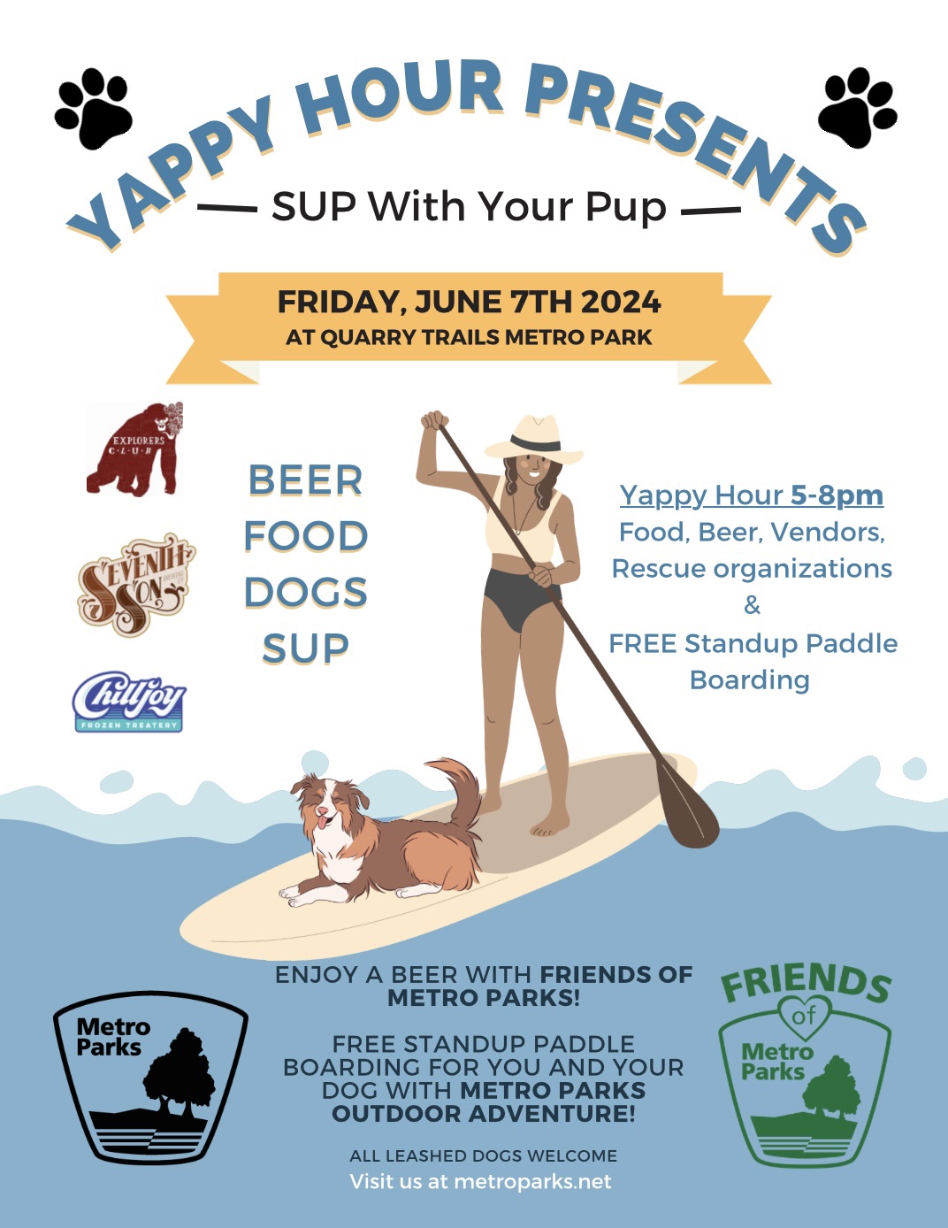 Looking for a new adventure with your furry best friend? Join Friends of Metro Parks and Metro Parks Outdoor Adventure for Yappy Hour Presents: SUP with Your Pup on Friday, June 7th to make new memories, enjoy food and drinks, and learn tips for introducing your dog to paddling. Whether your dog loves it, or thinks you’re a little crazy, you’re both guaranteed to have a fun time trying! And it’s FREE! Standup Paddle Boards will be available from 5-8pm. Yappy Hour hosted by Friends of Metro Parks will be running from 5-8pm. Food and beer will be available for purchase during Yappy Hour, as well as vendors, rescues organizations, and activities to enjoy!