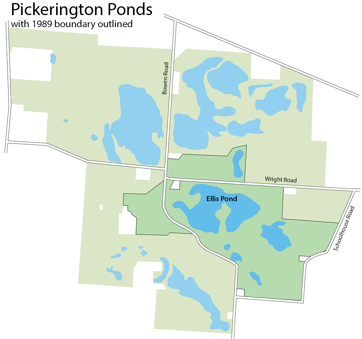 It was agreed that something like 400 acres would need to be acquired for public ownership in order to preserve the necessary ecological balance of the wetlands. Arrangements were made for Metro Parks to manage the acquired lands as a nature preserve, available for observations and scientific study, with the intention that it should eventually become a Metro Park. (See map of Pickerington Ponds below, with the original 413-acre Metro Park, as it opened in 1989, highlighted over the rest of the now 1,608-acre park).