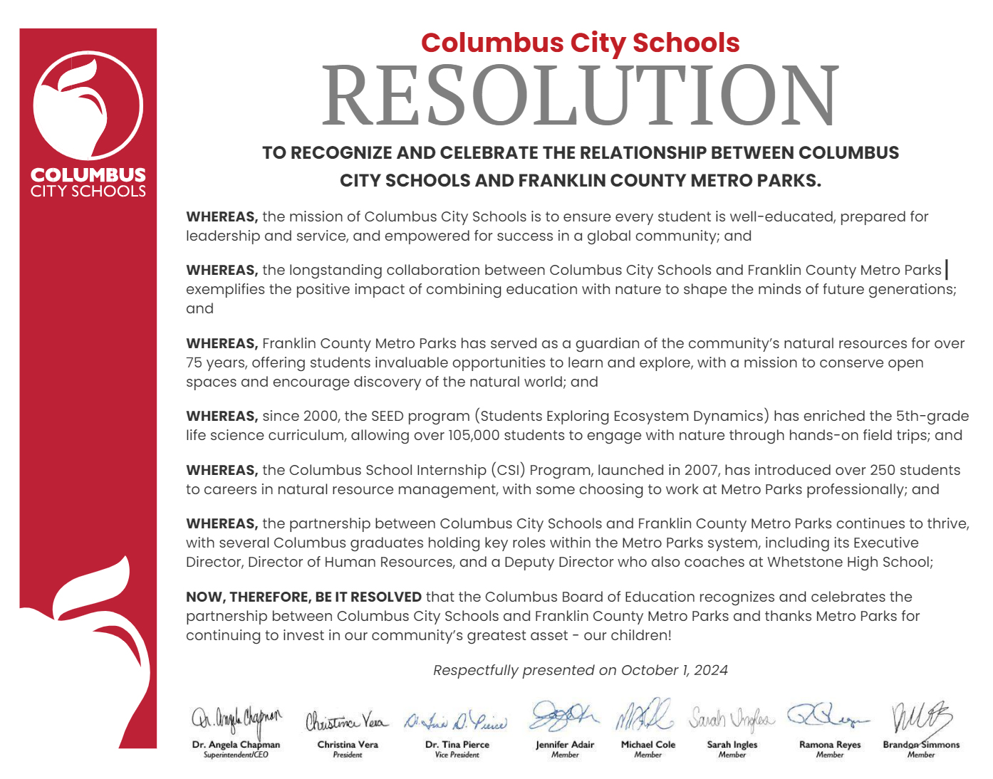 Columbus City Schools celebrated these, and many other collaborations with Metro Parks, with a resolution during their October 1, 2024 board meeting. And, of course, Metro Parks Executive Director Tim Moloney took a moment to thank them for their partnership and to remind them that his alma mater, Whetstone, was the best high school.