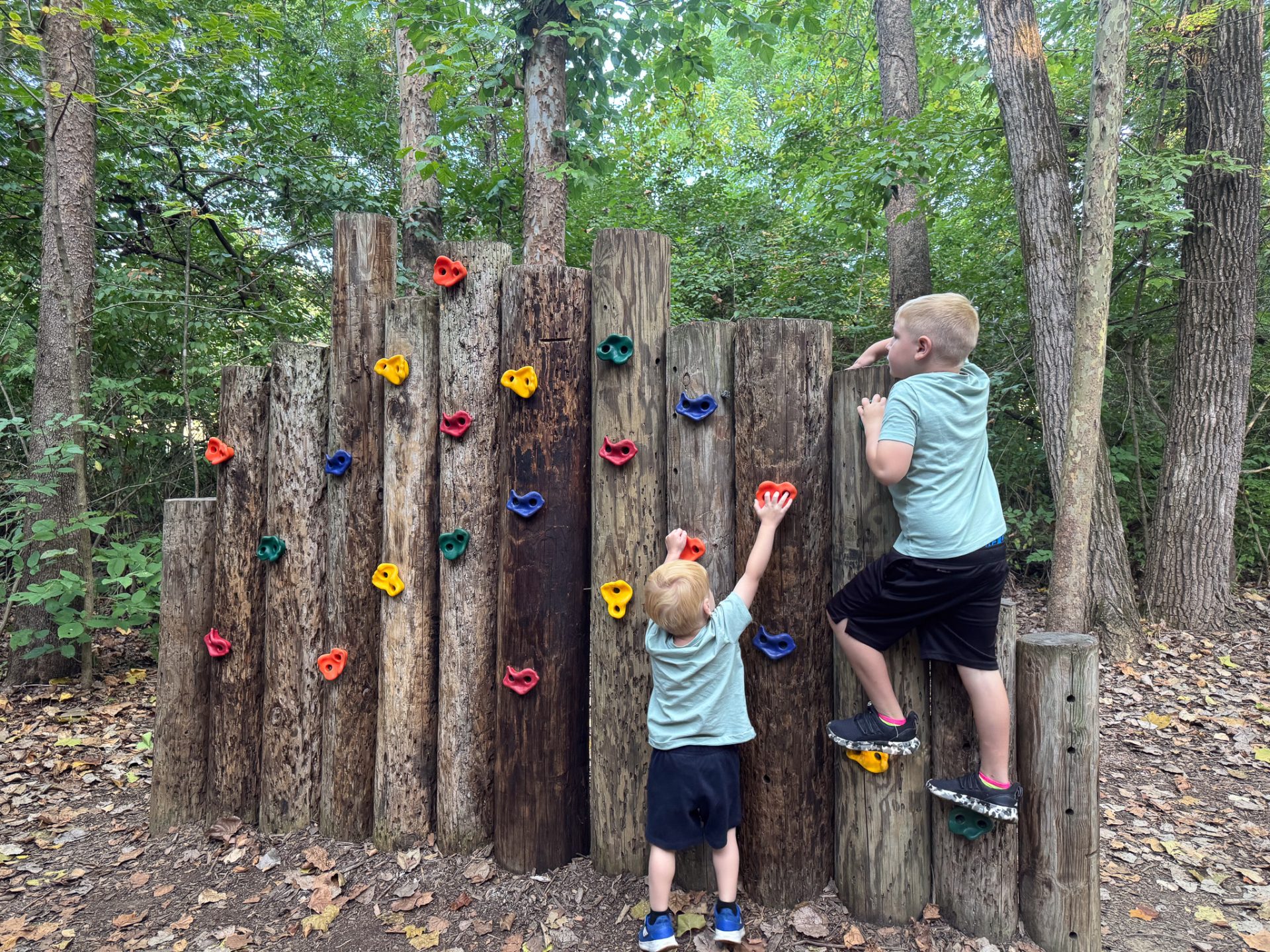 The Natural Play Area began its life humbly as a scout-created trail, carved into the woods between a field and the Olentangy River. With each new project, space was cleared in the forest understory —mostly invasive honeysuckle, a bonus— to accommodate the latest play equipment until the simple trail, in time, became a sprawling area. The first playground equipment was a rope spiderweb. Now the Natural Play Area features a teeter totter, parallel bars, balance beam, assorted climbing structures, an artsy totem pole, monkey bars, treehouse, photo-op cut-outs, seesaw, giant chair, rope course, a hanging bridge and swings.
