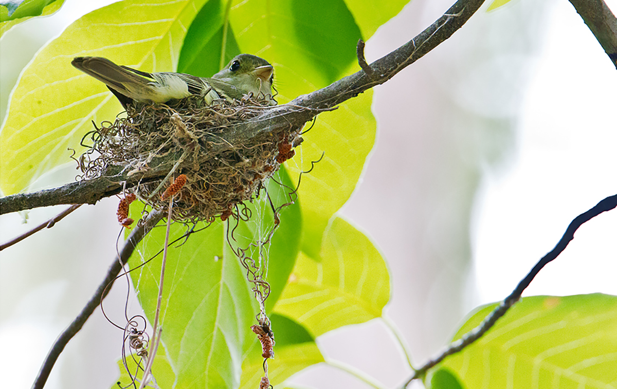 They’re a neo-tropical migrating species and normally arrive here in the north in May. Breeding season begins in June. They build their nests on forked branches of trees, anything from 3 feet to 50 feet above ground. The nests are made of fine twigs, grasses, bark strips and catkins, and are bound with spider or caterpillar webbing silk. The female birds build the nests, which are lined with finer grasses, hair, rootlets and plant down. They may hang a strip of vegetation from the nest, up to 2 feet, which may act as camouflage. Nesting season is usually May to August.