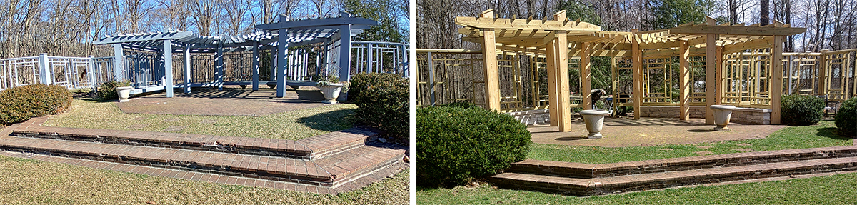 A signature attraction at Inniswood Metro Gardens has long been the Rose Trellis, with an arching display of a wide variety of carefully-tended roses. The rose trellis was added to the Rose Garden in 1988, built with funds donated by Cardinal Industries. However, when the outdoor wood structure began to show signs of decay over the past few years, the need for a major renovation or replacement was evident. Finding a contractor qualified to do the work was difficult. To make matters worse, cost estimates to fully replace the custom-made structure exceeded $300,000, a price tag that was simply too much. A new and more cost-effective approach was needed, so Metro Parks decided to handle the job in-house.