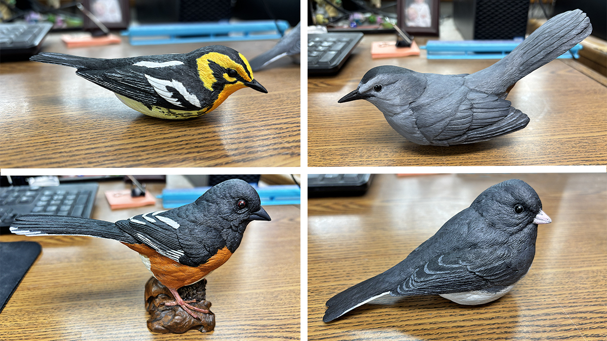 Here are four model birds painted by Craig. Top: Blackburnian warbler and a catbird; bottom: eastern towhee and a junco.