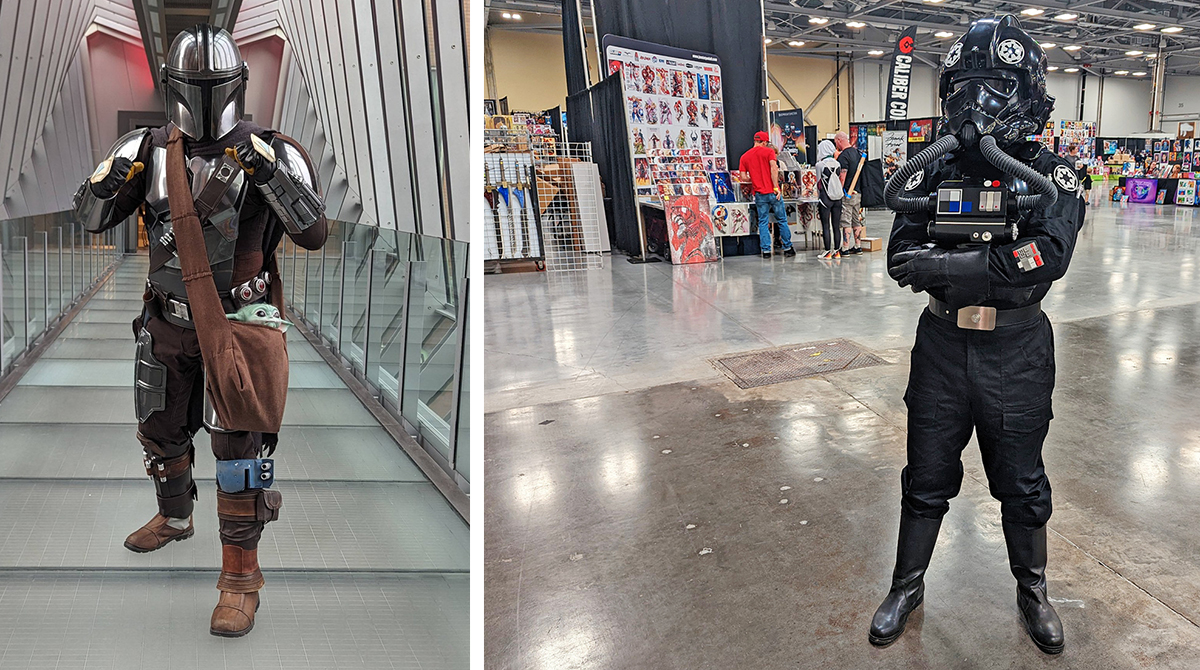 Craig in a couple of his Star Wars costumes. As the Mandalorian (left), carrying his apprentice, Grogu, and as a TIE fighter pilot (right).