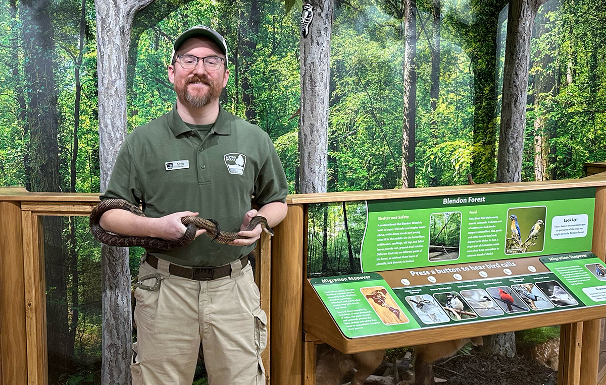 Craig at the nature center at Blendon Woods, with the center’s black rat snake. Photo Virginia Gordon