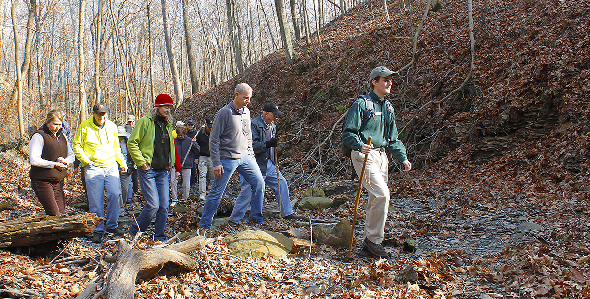 Craig, then a naturalist intern, leads an off-trail ravine hike at Highbanks. Photo Cheryl Blair