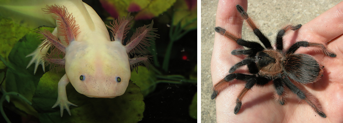 TWO OF CRAIG’S PETS: Opal the axolotl (left) and Emilia the tarantula.
