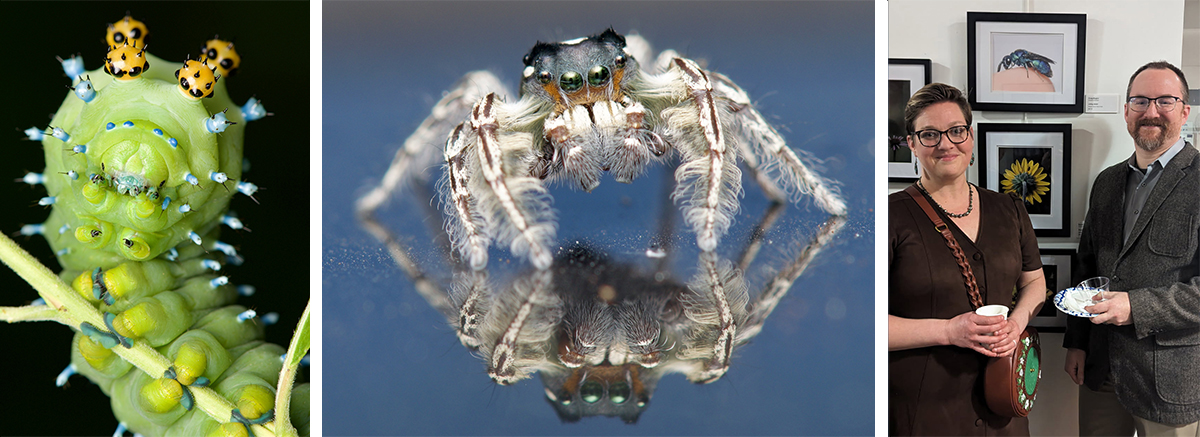 A BIG PHOTO HOBBY: Perhaps Craig’s favorite photos of his is the cecropia moth caterpillar, left, and another fave is this Putnam’s jumping spider, which settled on his car and made this marvellous reflection. On right, Craig and Salie together in front of his photo of a cuckoo wasp, which was accepted into the current photo exhibit at the Grange Insurance Audubon Center (GIAC) in Scioto Audubon Metro Park.