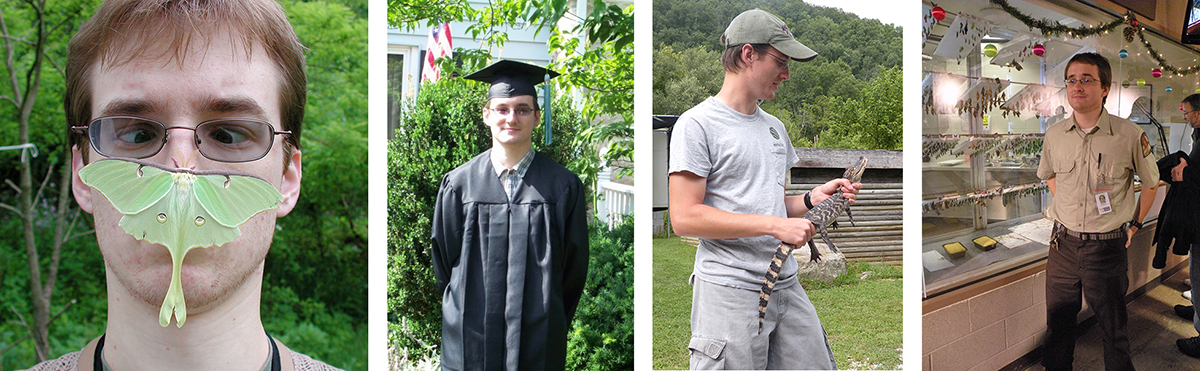 PROGRESSION: Craig at Denison’s Biological Reserve with a luna moth; graduation from OSU; with an alligator during an internship at the Kentucky Reptile Zoo, and as an animal keeper at the insect building of the Omaha Zoo.
