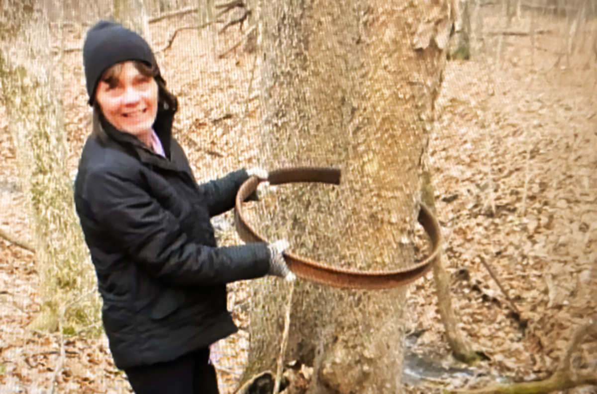 As a part-time ranger, there’s a wonderful balance between the law enforcement demands of the job, and the customer service element, which allows me that leeway to share my knowledge of nature and of the park with our park visitors. We had a lot of law enforcement training in my earlier days, which I thoroughly enjoyed and which guides my thinking as I’m out patrolling at the park. I’m very observant, and have a sense for when something doesn’t feel quite right. Many times, that has helped me to thwart potential crimes, like break-ins. I love patrolling the park, which grants me the opportunity to experience the natural beauty at Slate Run and to see so much wildlife and the beautiful woods, wetlands and native plants. I must have hiked near enough every inch of the park, even off-trail, and I consider Slate Run akin to my second home. I get to see things that most visitors never get to see, including odd things sometimes. A sycamore completely encircled by the rim of a bicycle wheel certainly qualifies in that odd-sights category. The wheel had probably been dumped on site long before Slate Run opened as a park, and a new sycamore had germinated from seeds and grew from a sapling to a mature tree spot in the middle of it. The tree is probably 50 years old or more now.