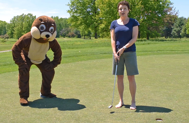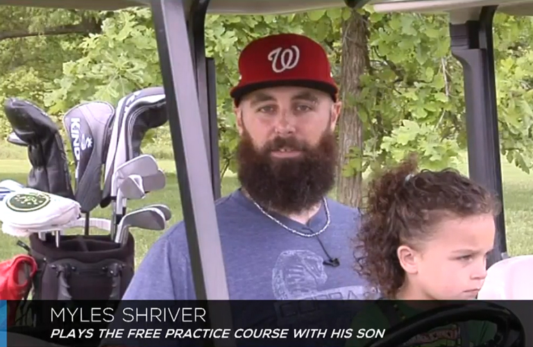 Metro Parks Executive Director Tim Moloney meets Myles and Andre Shriver on the practice course at Blacklick Woods Golf Courses, as free golf for Franklin County residents becomes a reality.