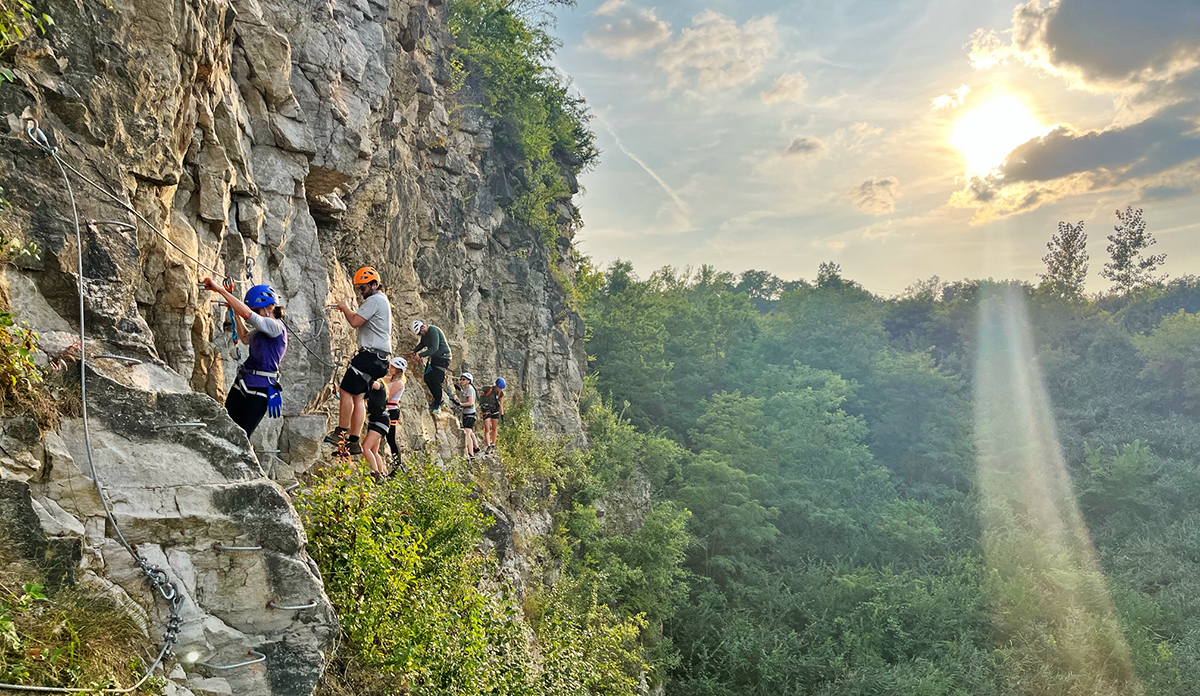 Climbers navigate the cliff face on Quarry Trails Metro Park’s via ferrata. Photo Stefan Bruch