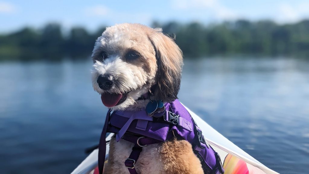 Violet (@violet_aussiedoodle) kayaking for the first time! Photo Rachel Travers