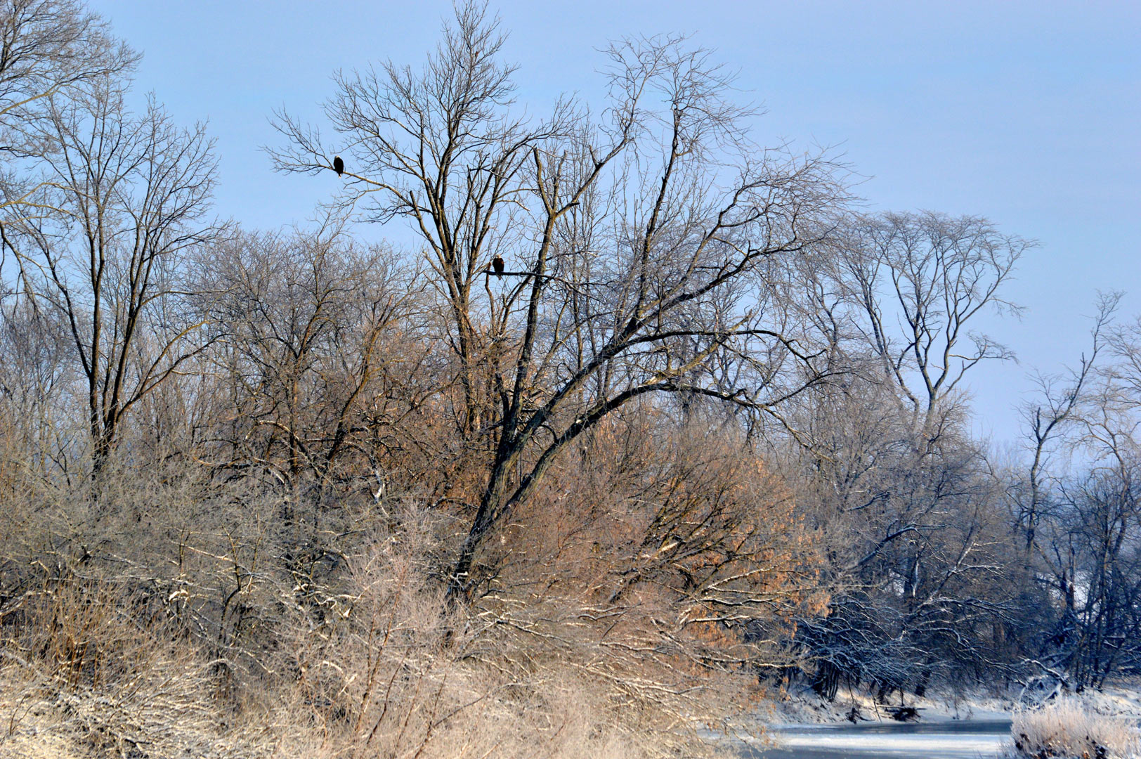 In late February, the eagles lay one, two or three eggs. Since the weather often remains cold through much of March, they must be very careful to keep the eggs from freezing. The two birds take turns sitting on the eggs, usually in two-hour shifts. While one sits, the other hunts.