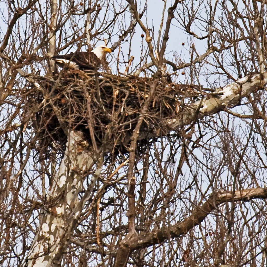 In late 2009, a bald eagle pair started investigating an abandoned raptor nest within Highbanks Metro Park, along the Olentangy River. They were young birds, by eagle standards, probably about four years old, and this was their first nesting attempt. Though the nest was hard to see, a few dedicated volunteers spent many hours from March to May 2010 monitoring the eagles. They used that old nest to successfully raise an eaglet, but the nest was later damaged in a storm and it seemed likely that they would have to leave.
