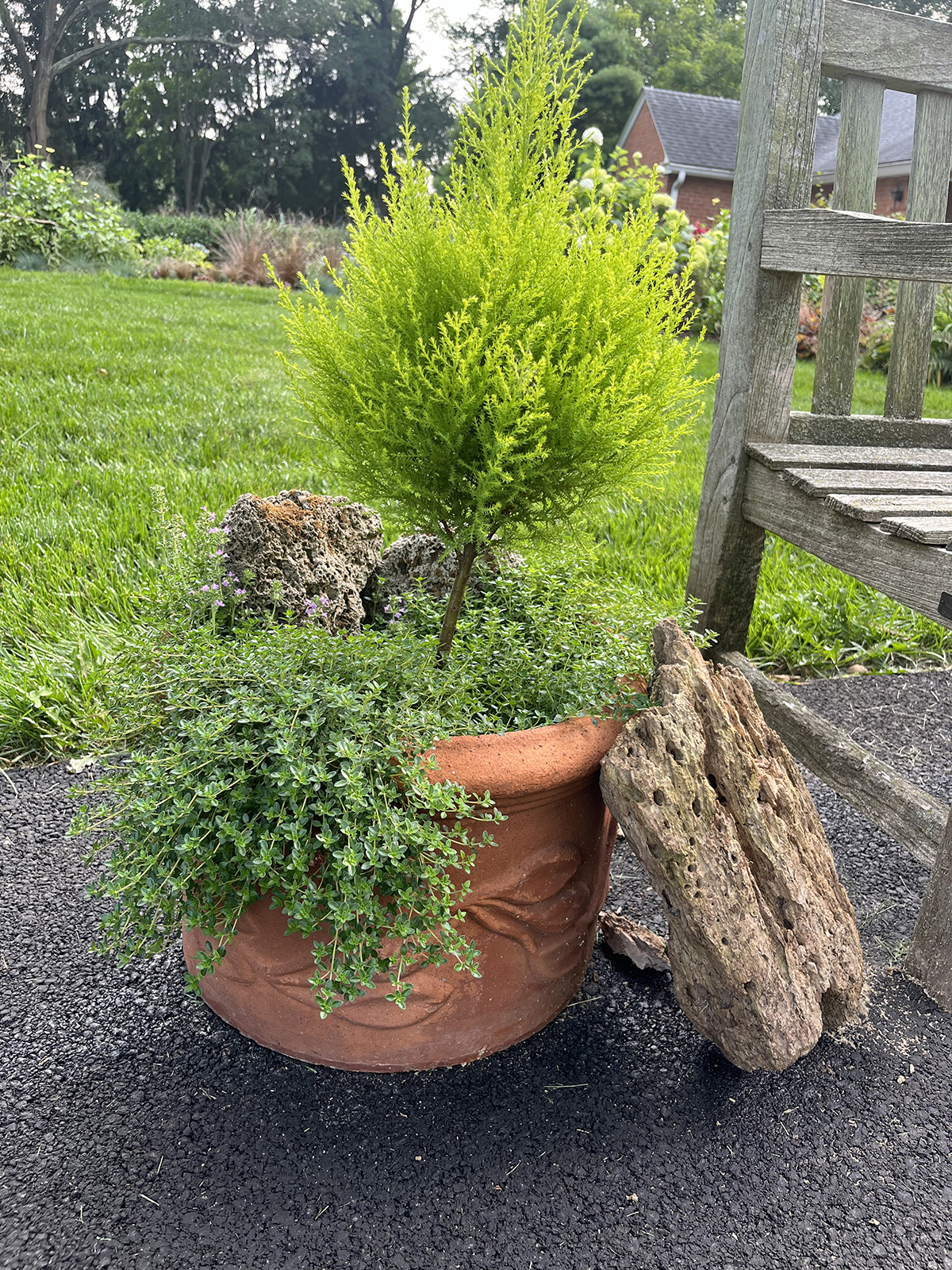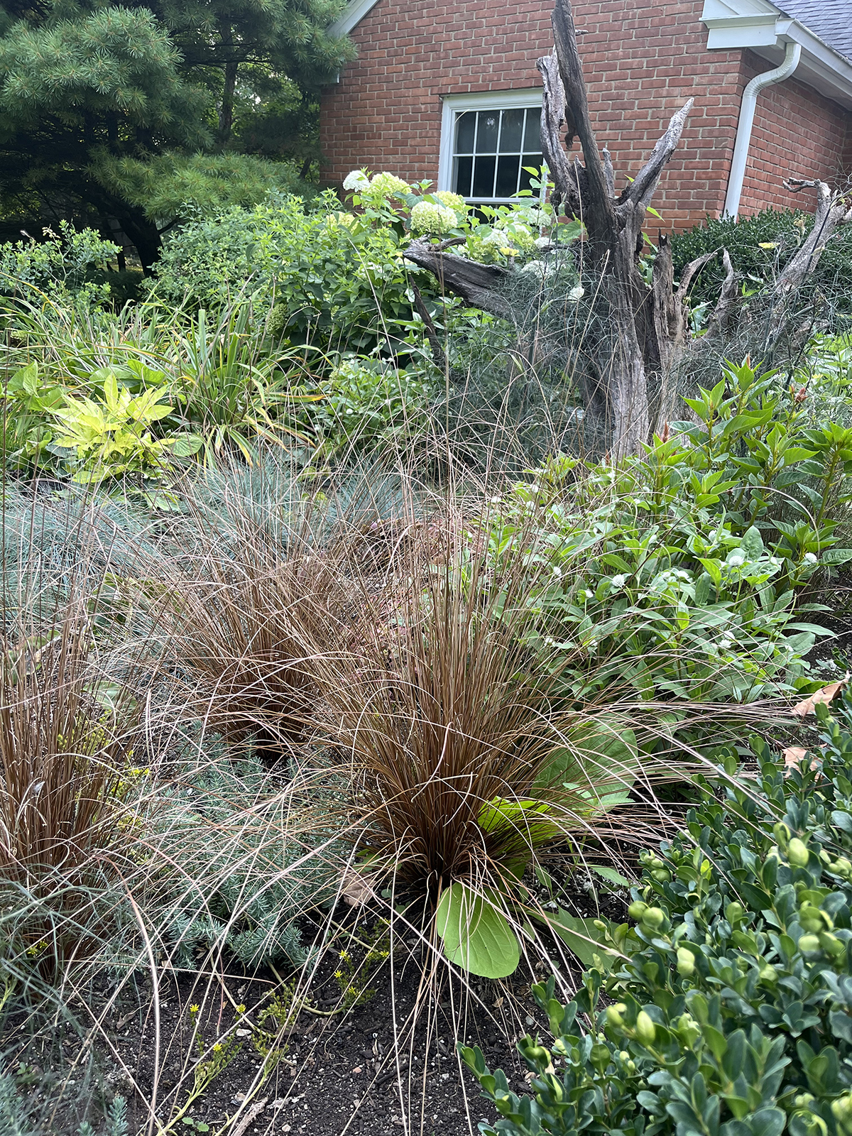 Plants such as Carex buchananii ‘Red Rooster’ create a pause and often bring confused looks followed by a common question: Is that plant dead? ANSWER No! A decayed tree stump and branches were artfully placed to symbolize a fallen tree within the bed.