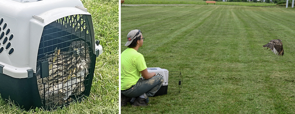 OWC volunteer Katie Orsini placed the kennel containing the red-tailed hawk onto the grass, as we closed in to get a better view. The bird’s feathers were reminiscent of very late sunset. The bird poked a bright yellow claw through the metal grate, eyes of neither fear nor excitement but what looked more like plain annoyance. Finding that he came with no official name, head maintenance worker Brian Scheiderer designated him Freebird, nodding to the Lynyrd Skynyrd rock song.