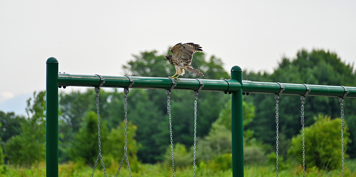 Still loitering on the top of the swingset, Freebird towered over the songbirds around him. After mingling with a group of small red-winged blackbirds, we finally watched our tame red-tailed giant soar up and towards the horizon. As a semi-migrant species, populations of red-tailed hawks in Ohio will often travel south for the winter and return in the early spring to the same general area. Others will simply remain in the state year-round. To our liberated bird of prey, a trailing mahogany comet, Park Ranger Rachael Knierim offered: “Enjoy the parks! Or…” — shrugging— “wherever you end up.”