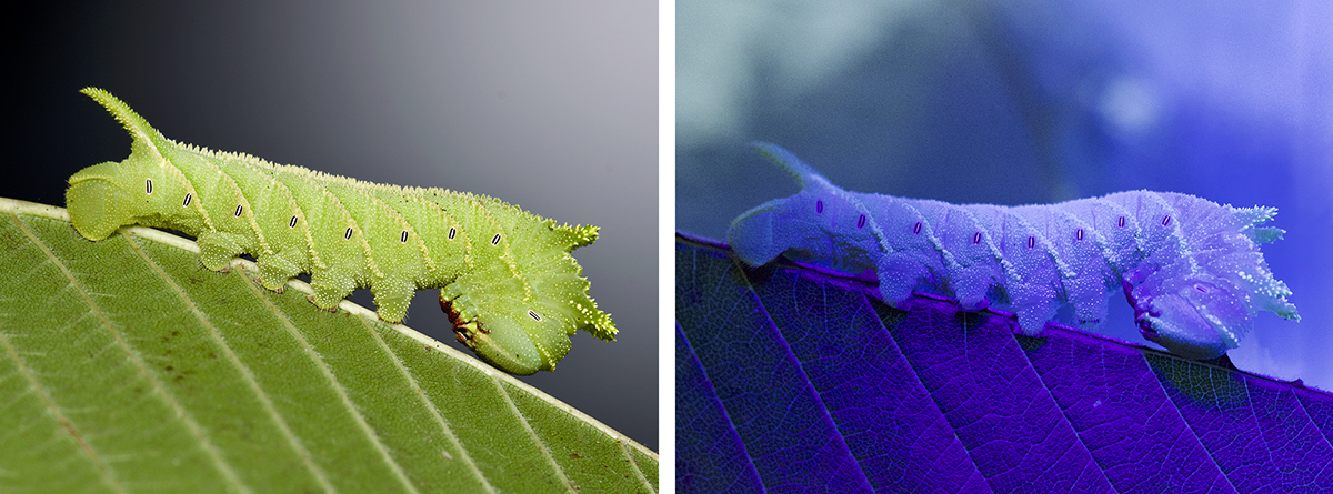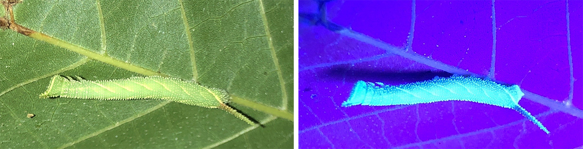 Caterpillars are often well camouflaged, since they must avoid hungry birds if they are going to turn into a moth or butterfly. Bright green caterpillars hide well among the leaves that they feed on, but UV lights can make them easier for us to spot. Look for caterpillars like the luna moth, inchworms and hornworms on native shrubs, trees or flowers.