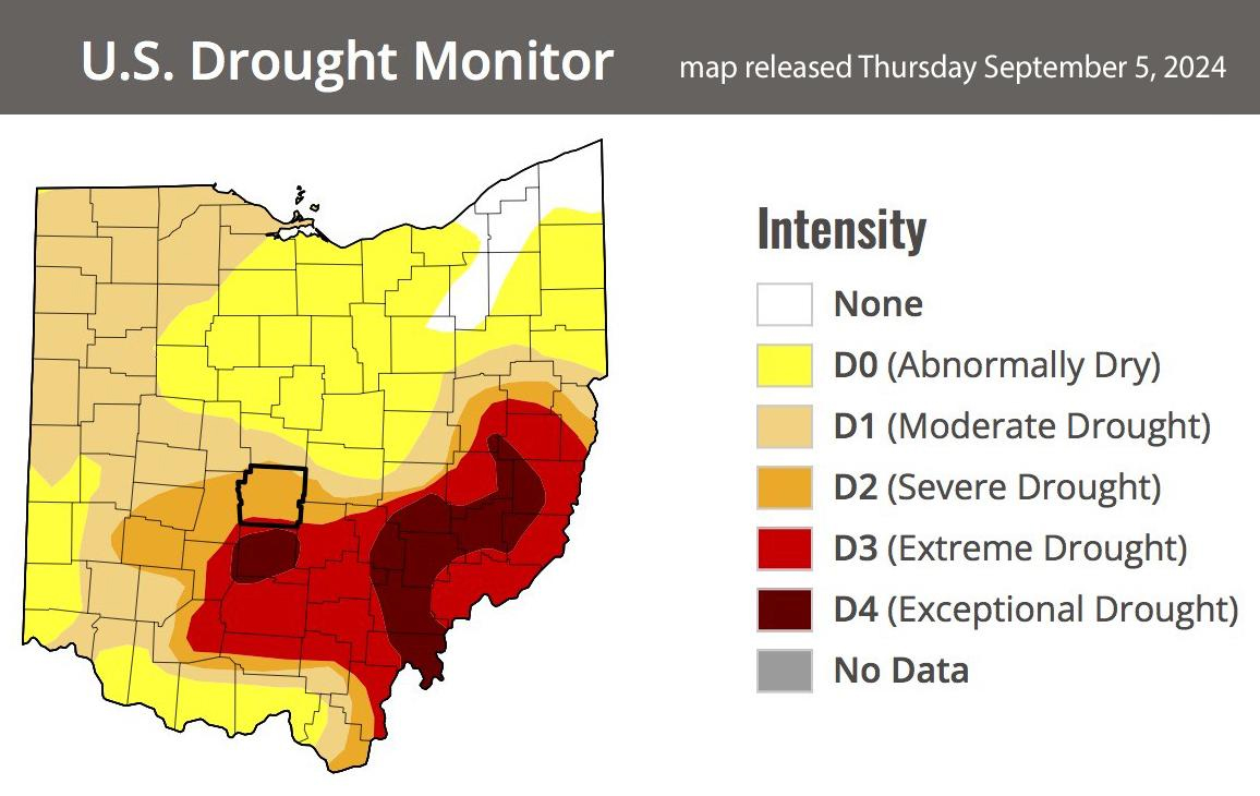 Currently Franklin County is experiencing a D2 Severe Drought according to the US Drought Monitor. In discussions with Franklin County Soil and Water Conservation District, we learn that Franklin County is seeing almost 8 inches of rain deficit, making this the driest summer since 1948. Just south of Franklin County, Pickaway County is enduring a D4 Exceptional Drought.