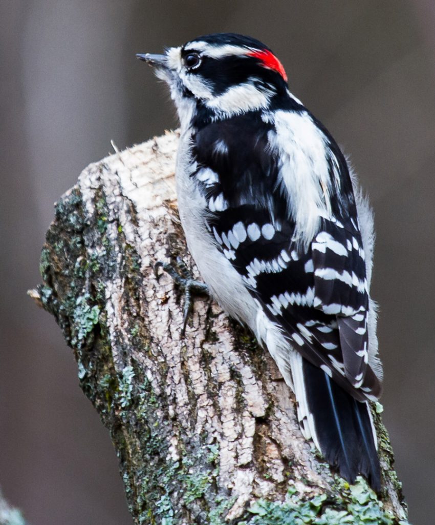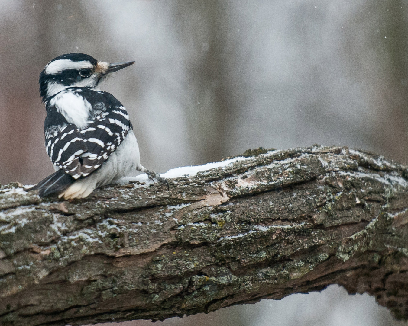The most common species in Ohio is the DOWNY WOODPECKER, which is also the smallest. They are often seen at feeders in the parks, munching away in amongst the chickadees and nuthatches. They are an attractive woodpecker, with black-and-white striped faces, black back with white spots on the wings, and a white breast. Males stand out because of the dramatic red patch on the back of their heads. HAIRY WOODPECKERS, which are less common in Ohio, look almost exactly the same, but they are about three-times heavier and have a longer bill.