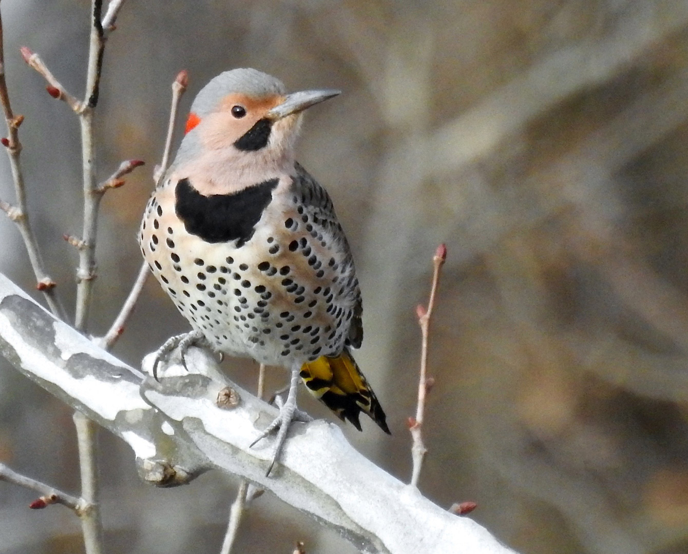That’s five of the seven species. The last two aren’t called “woodpecker” in their name, but they are of the woodpecker species nonetheless. The NORTHERN FLICKER is a large woodpecker, with a rounded head and downcurved bill. They are very attractive birds too, but brownish overall, rather than black, with bright yellow tail feathers, and yellow also on the underside of the wings. Their brownish feathers are scalloped with black spots and crescents, and they have a touch of red on the back of their heads. Unlike other woodpeckers, they spend more time on the ground, as their preferred food includes beetles and ants.