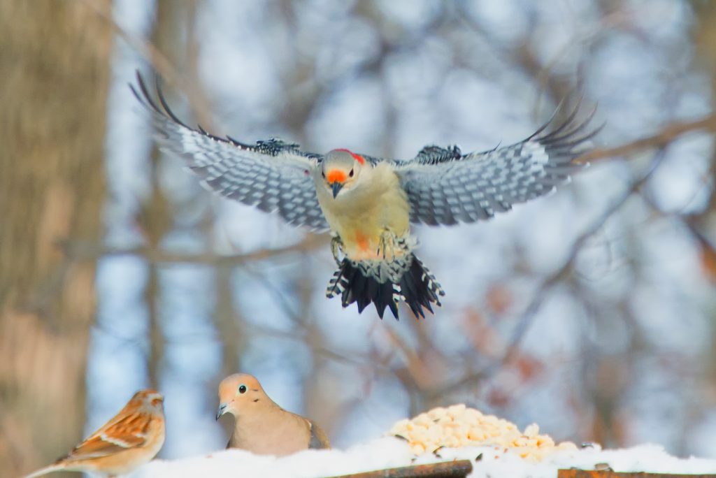 Perhaps the most striking and beautiful of the species are the RED-HEADED WOODPECKERS. As the name indicates, their entire head is red, a bright and beautiful crimson. The rest of the bird is striking too, with black backs and large white patches on the wings. Unlike the other woodpeckers, which haven’t mastered this skill, red-headed woodpeckers can catch insects while in flight.