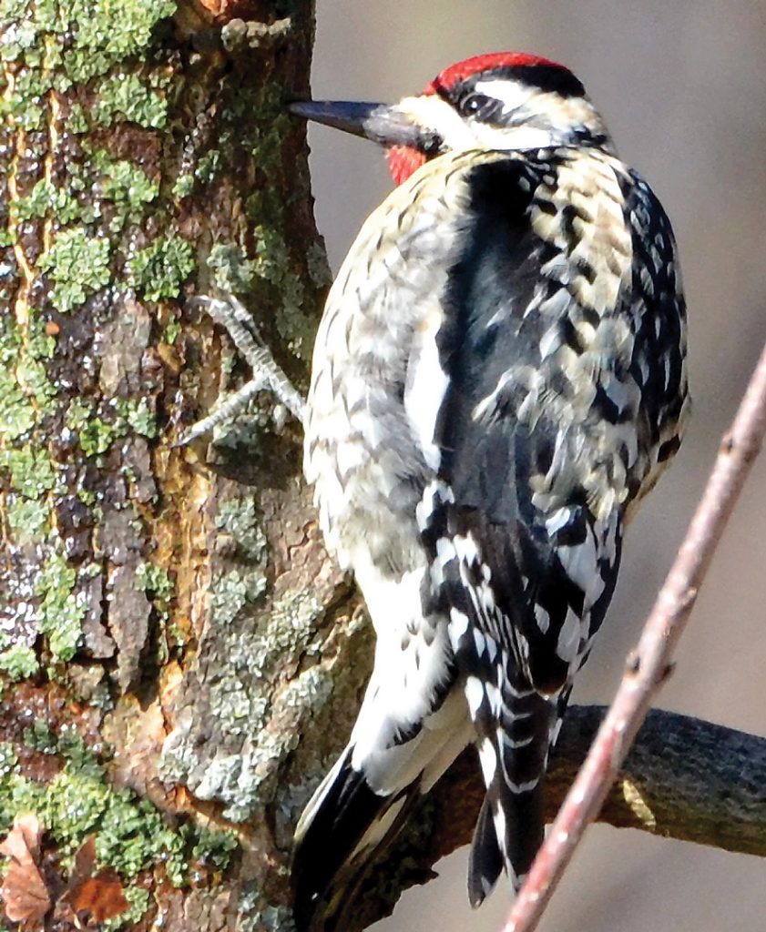 The final species of woodpecker for you to look out for is the YELLOW-BELLIED SAPSUCKER. They earned the name because they lap up sap that leaks from the small holes they drill in trees, and feast on any insects trapped in the sap. They have a brush-tipped tongue that helps them get at the insects. They have a red cap, and the males also have a red throat. Black-and-white stripes curve from their faces to a black shield on their chests, with white or yellowish underparts. They make a loud mewing call and sit for a long time on tree trunks while feeding.
