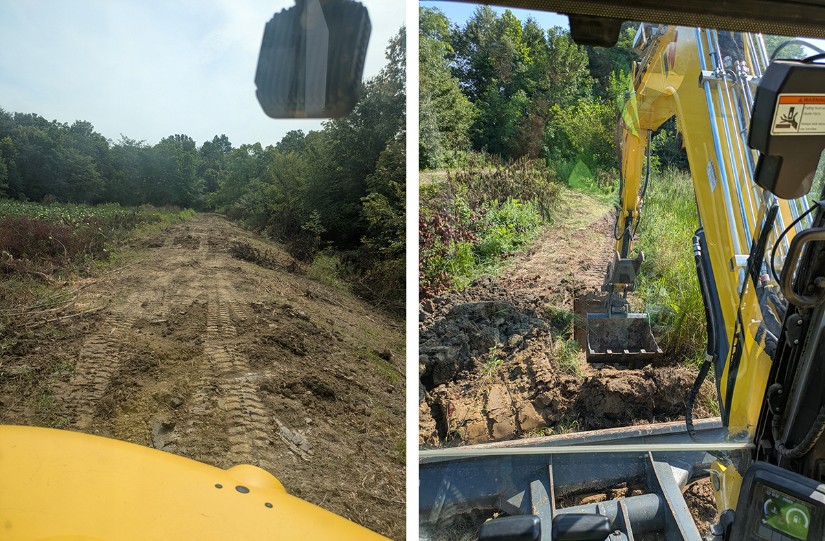 The fix was simple: cut down every tree and shrub on the berm, and remove all of the roots. While that seems like a lot, we were fortunate to have the help of our handy dandy forestry head, which made quick work of the tree removal. We also rented an excavator for digging the roots out of the berm, and then packed the voids with clay. It went smoothly, and no one got any equipment stuck, I swear!
