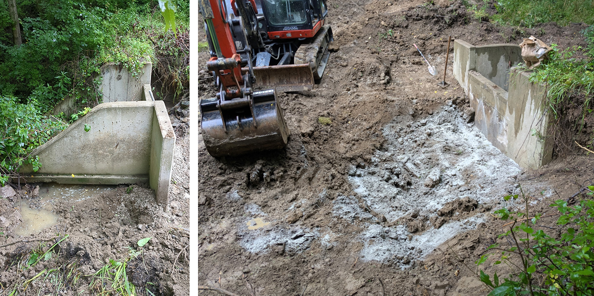 The Sharon Woods dam. Ideally, the water would go over the dam, not under. And here is the solution, making a new berm and mixing bentonite into the clay. Photos River Morrison