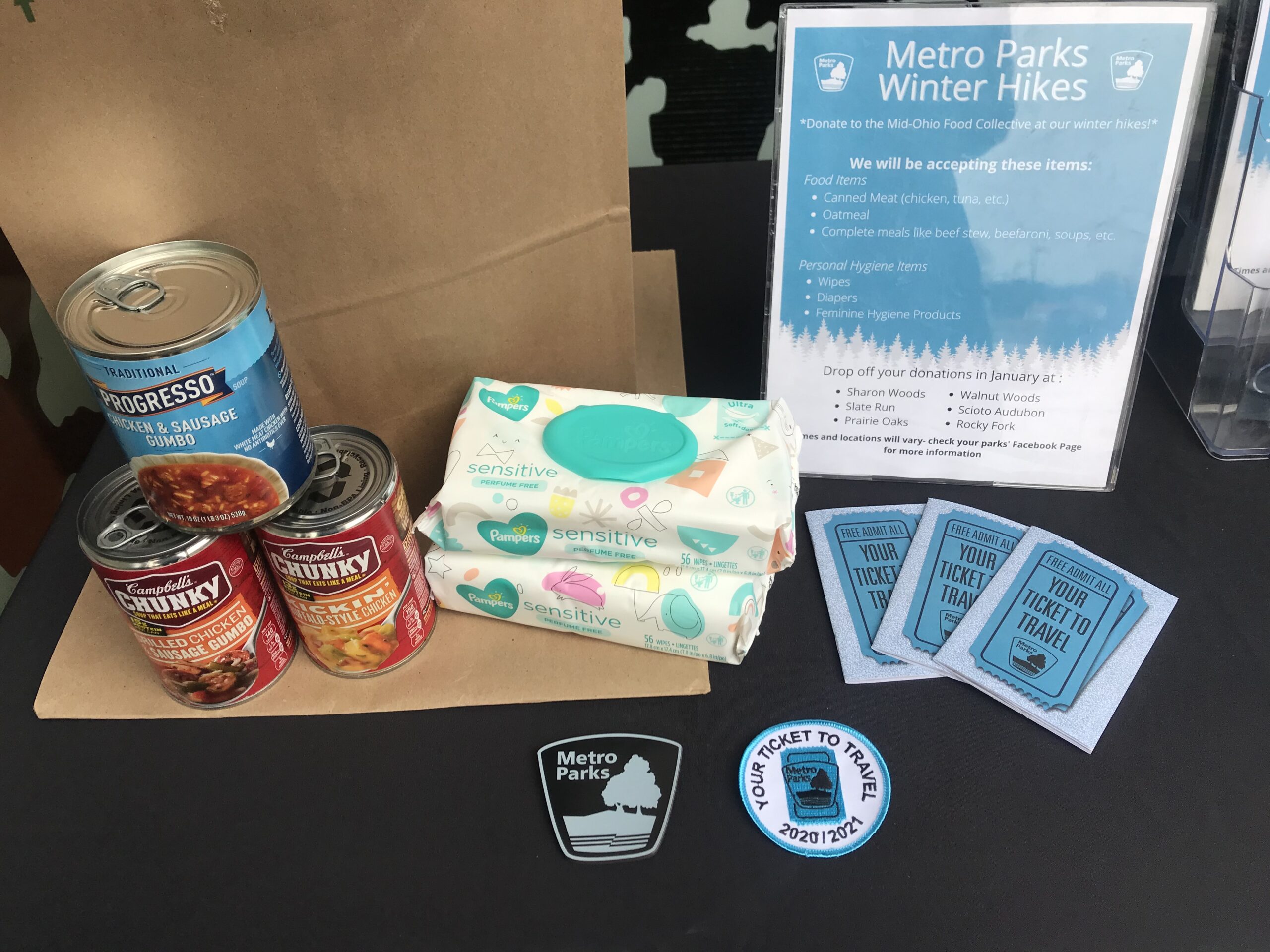 Give back while getting out! Metro Parks will collect donations and raise money for the Mid-Ohio Food Collective during our January winter hikes. Last year, we raised $1,820 that went directly to feeding hungry families in Franklin County and the Central Ohio area. We also collected nearly 2,000 lbs of personal hygiene products and canned food items that helped Mid-Ohio Food Collective’s efforts. We are thrilled to continue to collect canned food and personal hygiene items for this worthy cause. Items most needed include: canned meat (chicken, tuna, etc.), oatmeal, complete meals like beefaroni, beef stew and soups. The most needed personal hygiene products are: wipes, diapers and feminine hygiene products. Stop by Metro Parks table at the locations and times below to drop off donations, get your Ticket to Travel booklet stamped or pick up your Winter Hikes Patch. We hope to see you there!