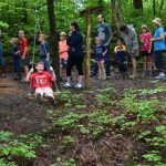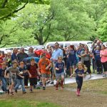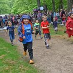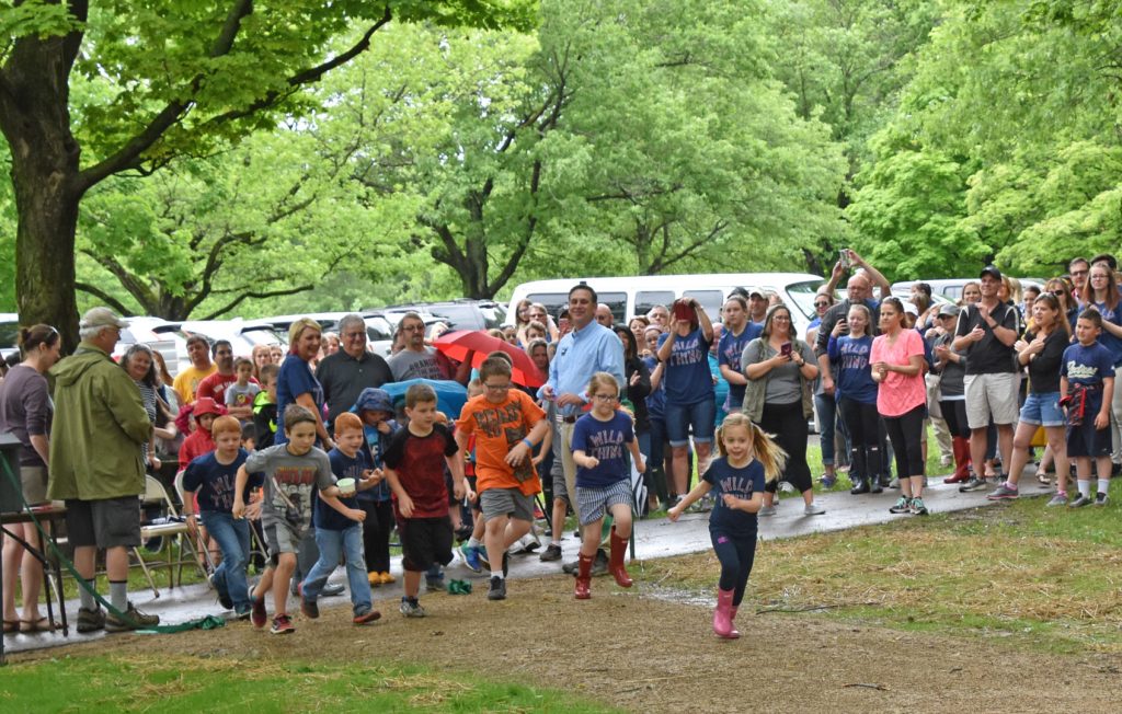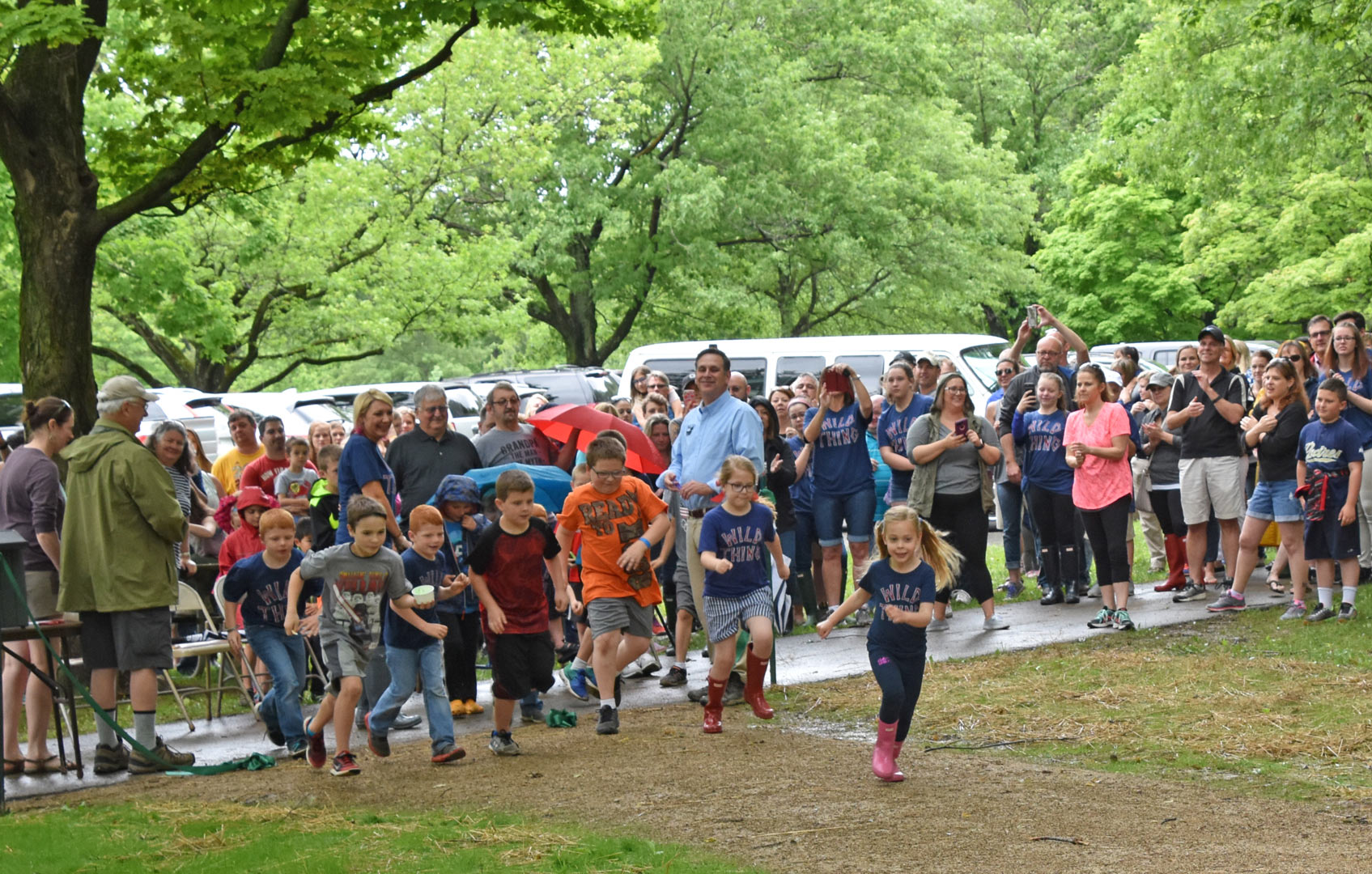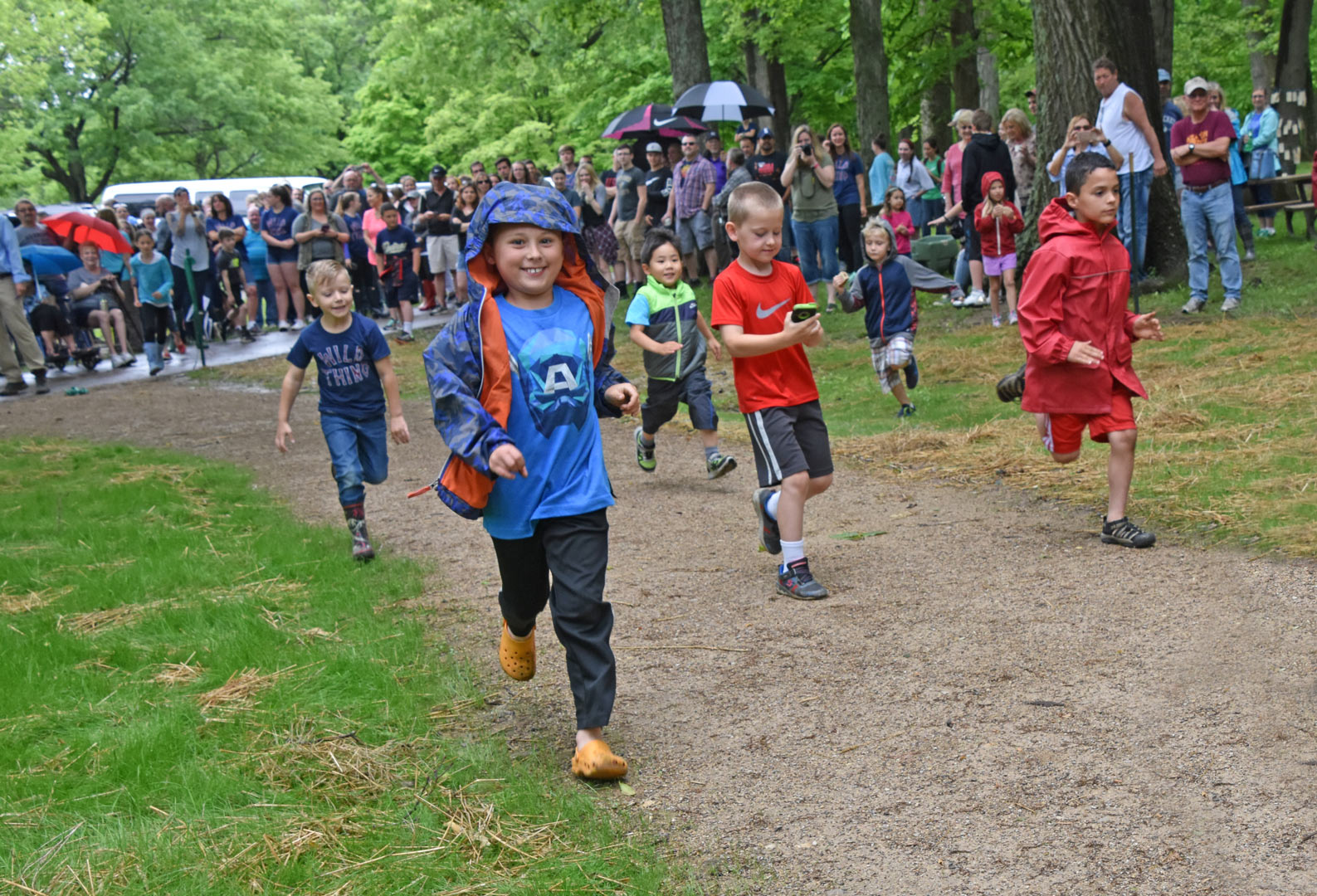 Maris Zugaro leads the charge as kids run to the natural play area at Blendon Woods following the ribbon cutting.