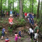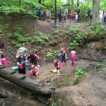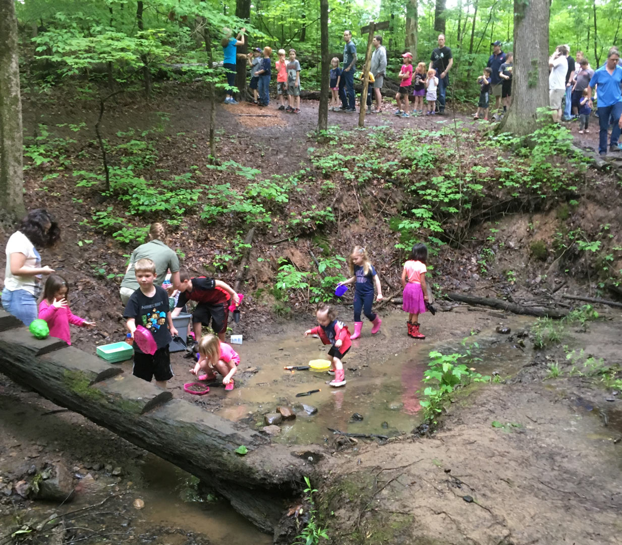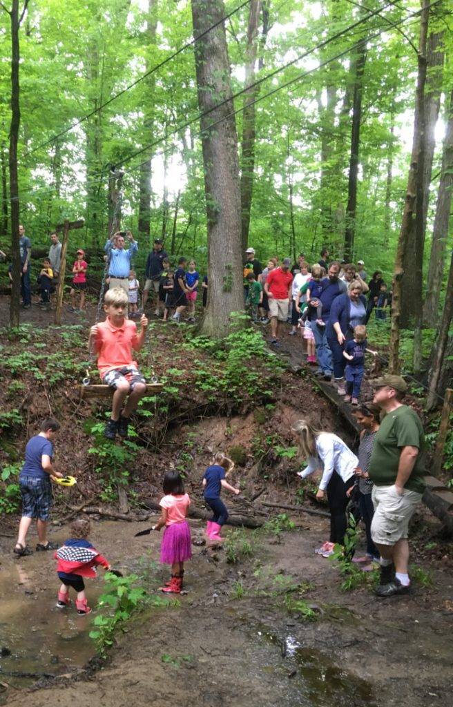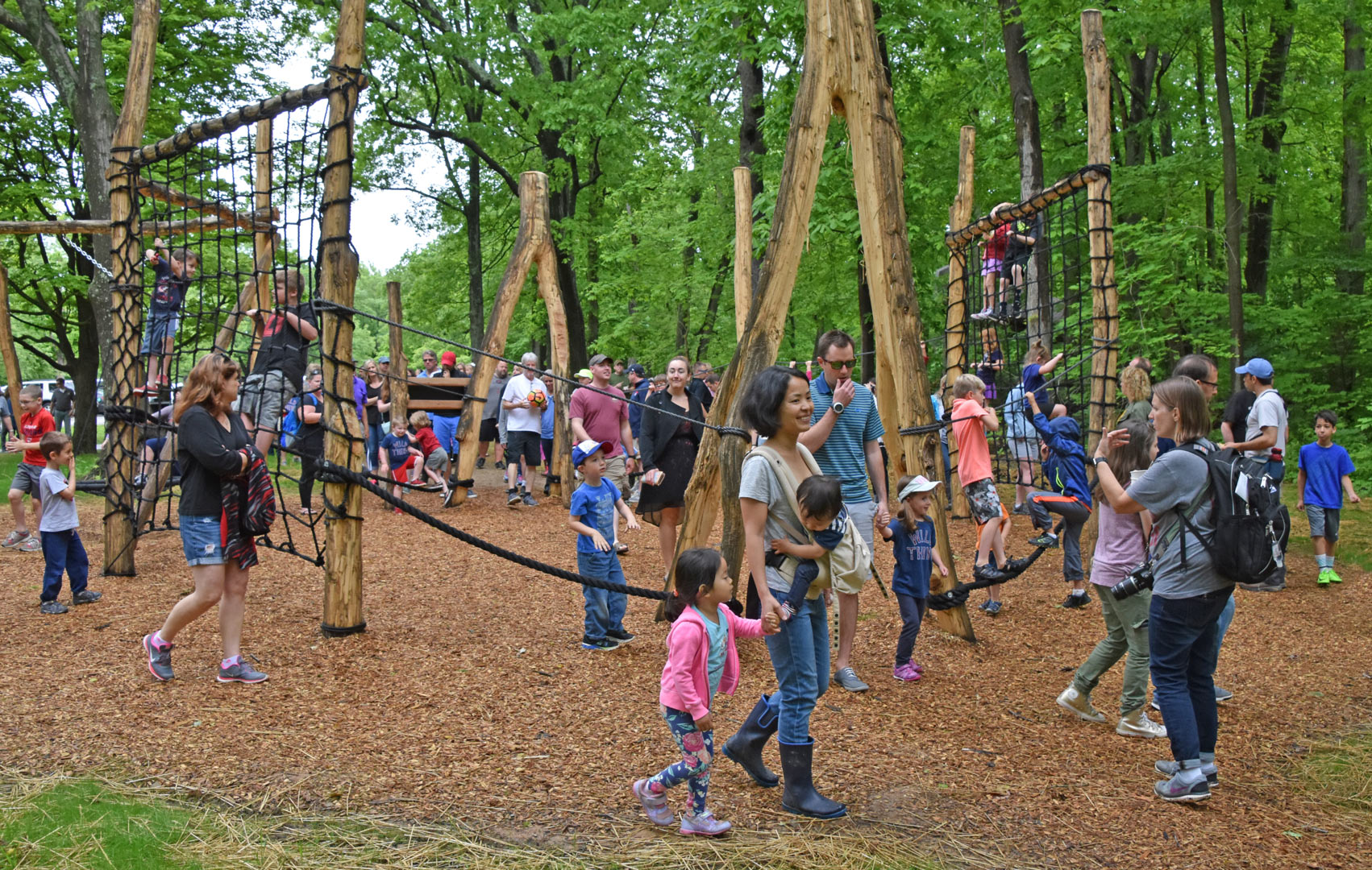 Visitors enter the natural play area at Blendon Woods after the ribbon cutting.