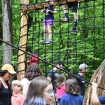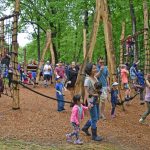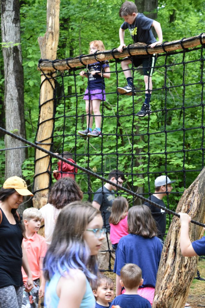 Kids climb the cargo net at the Blendon Woods natural play area.