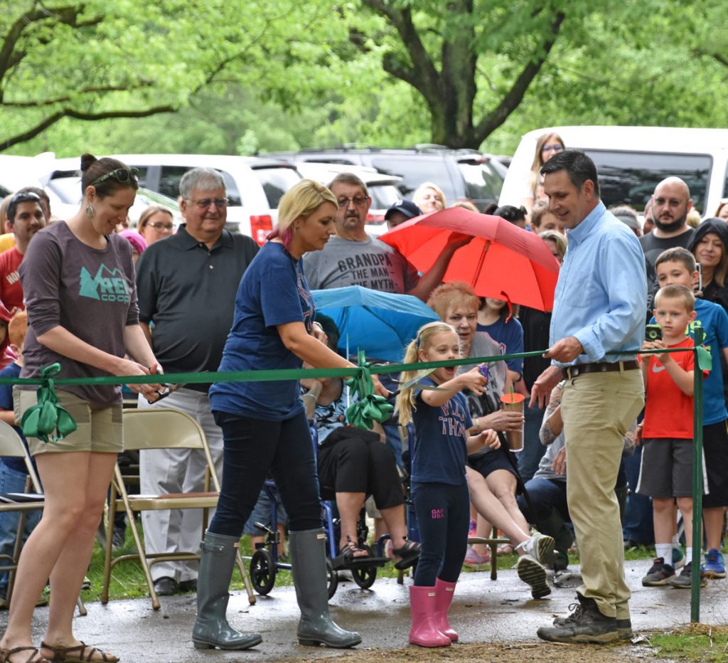 Maris and Michelle Zugaro are joined by REI's Abby Rhodebeck cut the ribbon at the Blendon Woods natural play area opening.