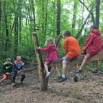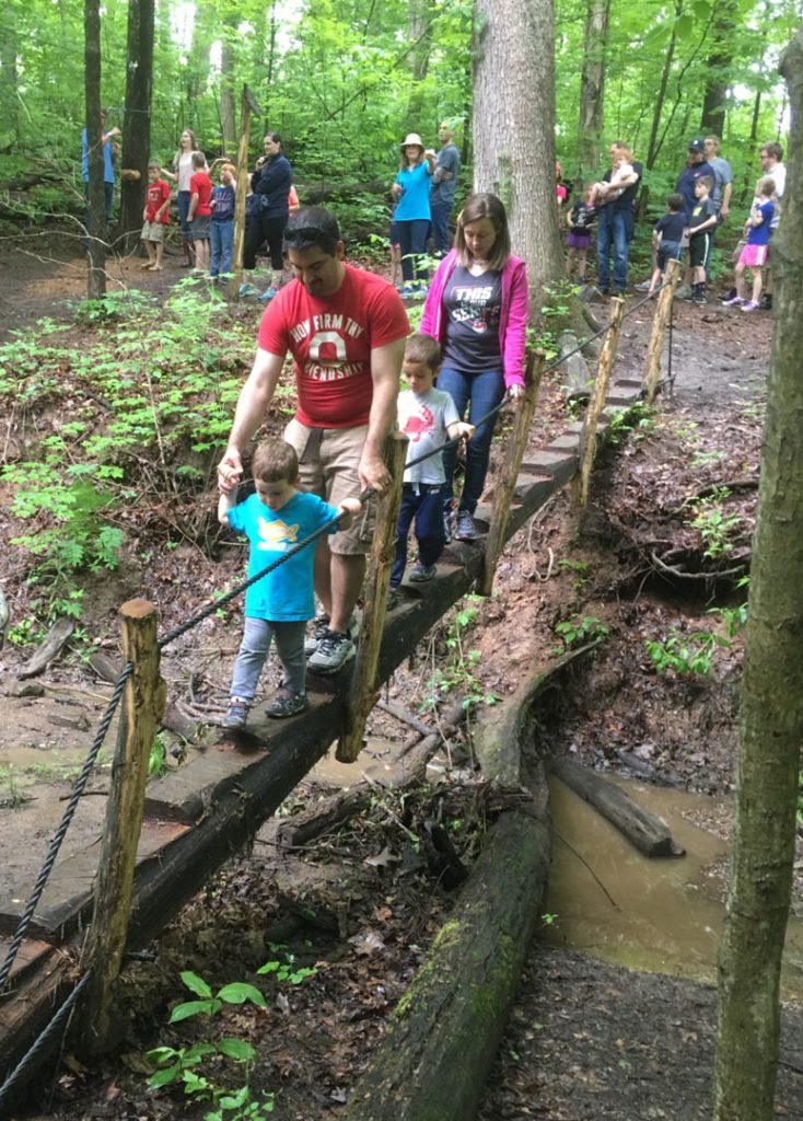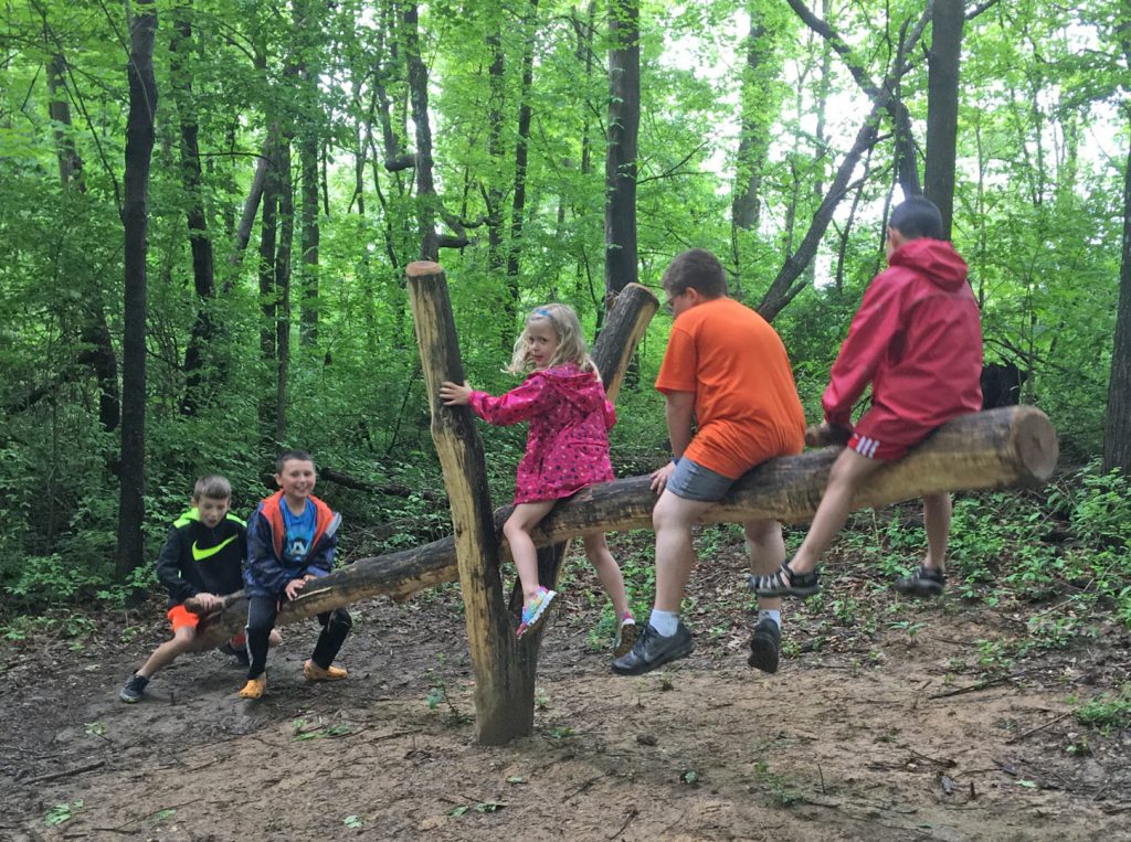Visitors cross a ravine on a stepped log at the blendon Woods natural play area.