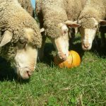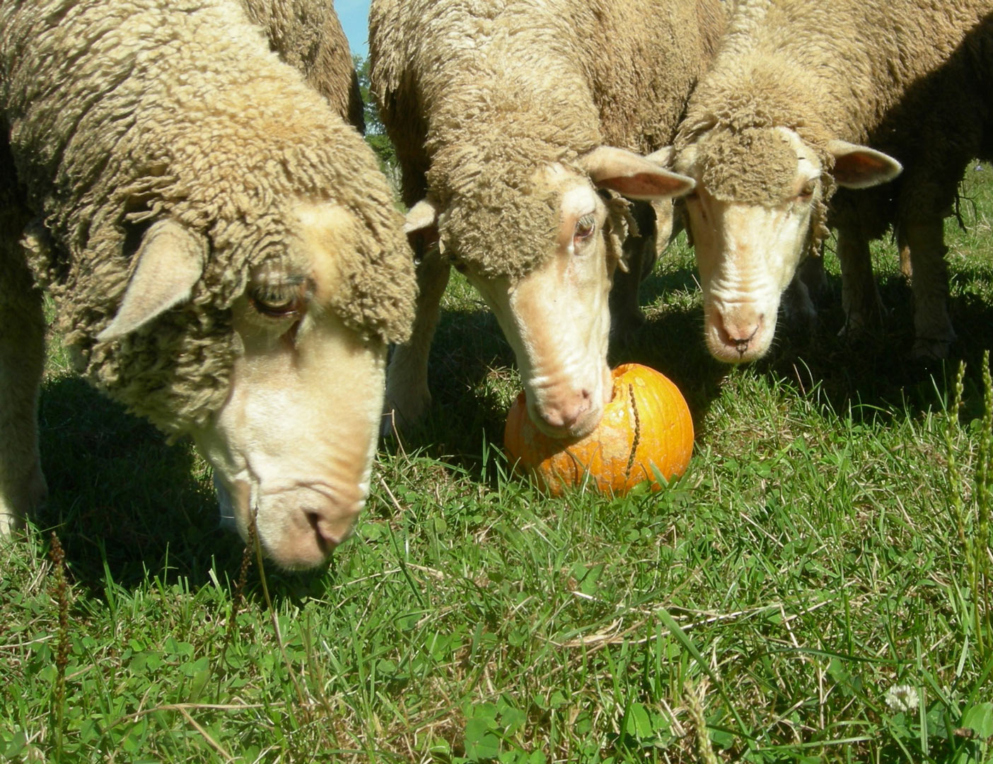 A Merino sheep munches on a pumpkin. (Farm photo)