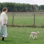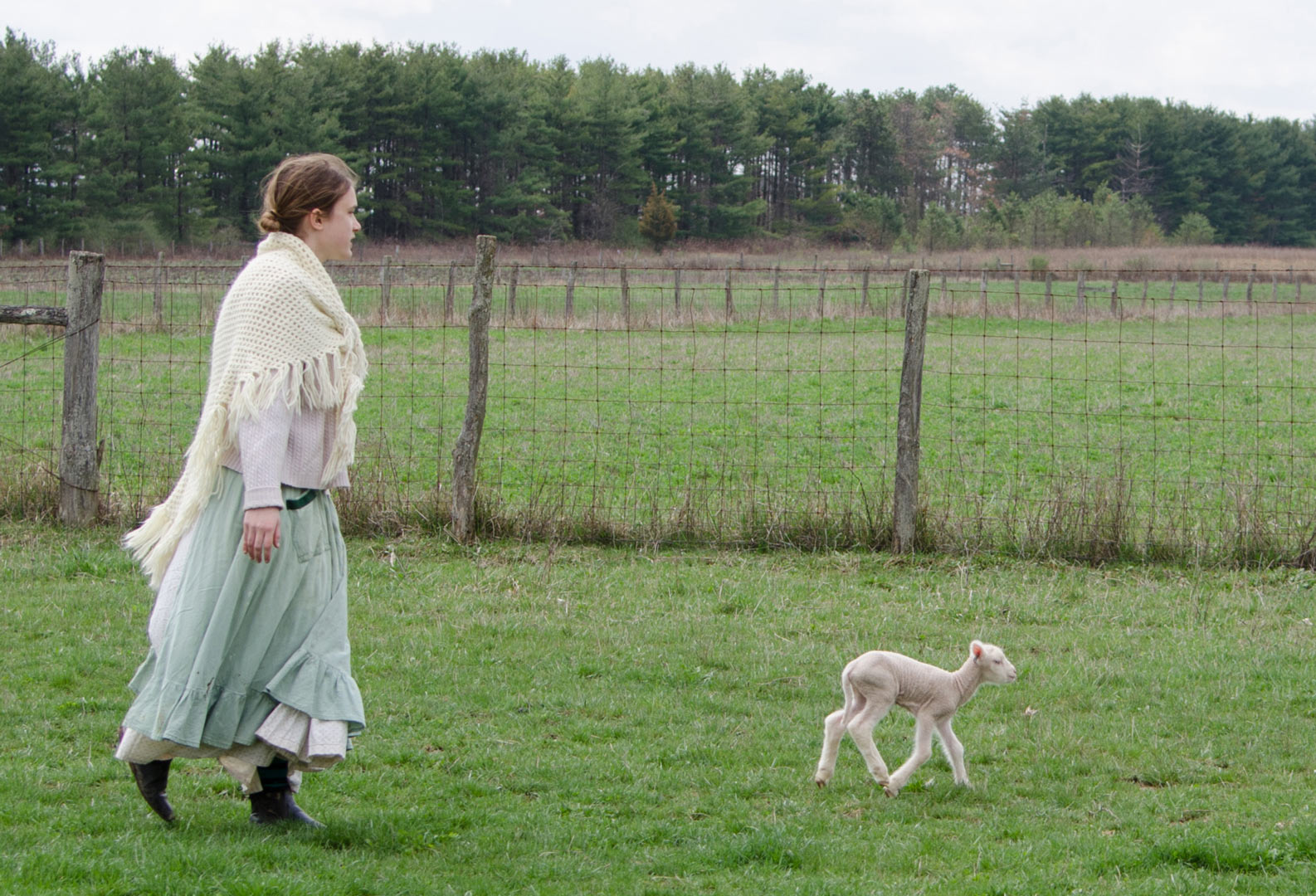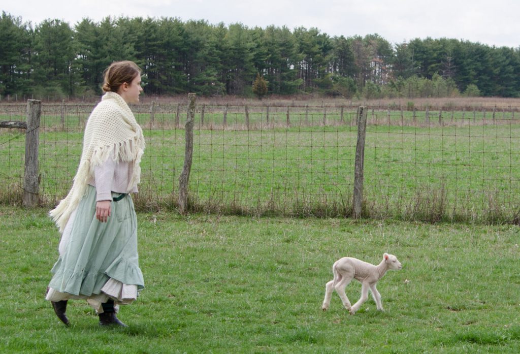 A Farm interpretive aide follows the progress of a very small but leggy lamb at Slate Run Farm. (John Cagnina)