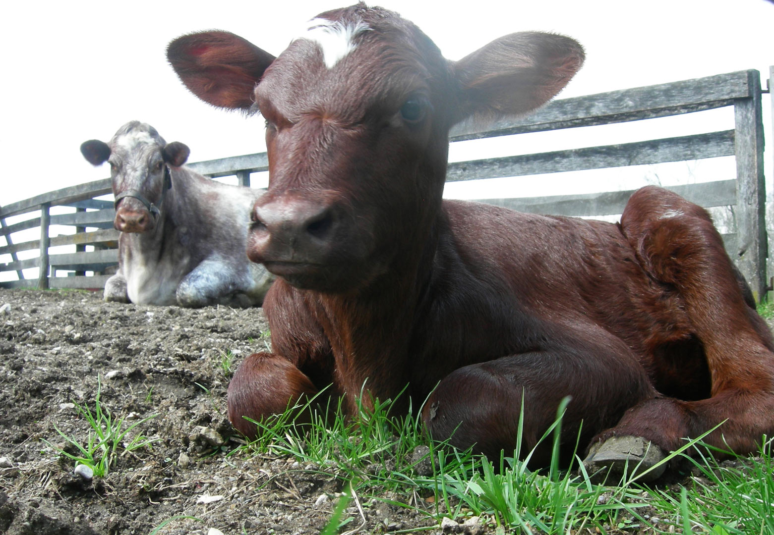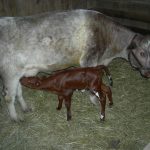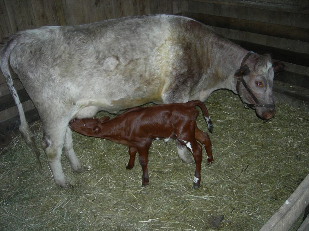 New-born Shorthorn heifer poses with mom in background. (Farm photo, April 2017)