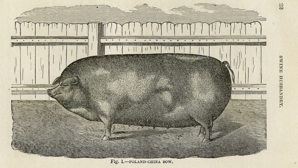 Poland China hogs have a long history here in Ohio. The breed was developed here in the mid-1810s and spread in popularity across the country. Poland Chinas are an excellent variety of hog since it provides both good quality meat and very good lard. Lard was very important in the 1880s since it was used in cooking, baking and soap making among other uses. Poland Chinas are still farmed today, but they have been bred to be leaner than their 1880s counterparts, since lard is not as important to us now.