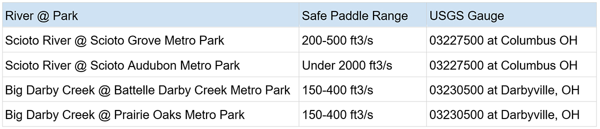 Whether you’re paddling, fishing, or hiking the banks of a river, finding out information about the stretch of river you are looking to visit can greatly impact your recreational experience. Several different rivers flow through our parks. At one end of the spectrum the Scioto River at Scioto Audubon Metro Park is impounded by the Green Lawn Dam creating a reservoir of wide deep water. Due to the dam this area of the river rises with stormwater and flooding waters, but through the hot dry summer months retains navigable waters.