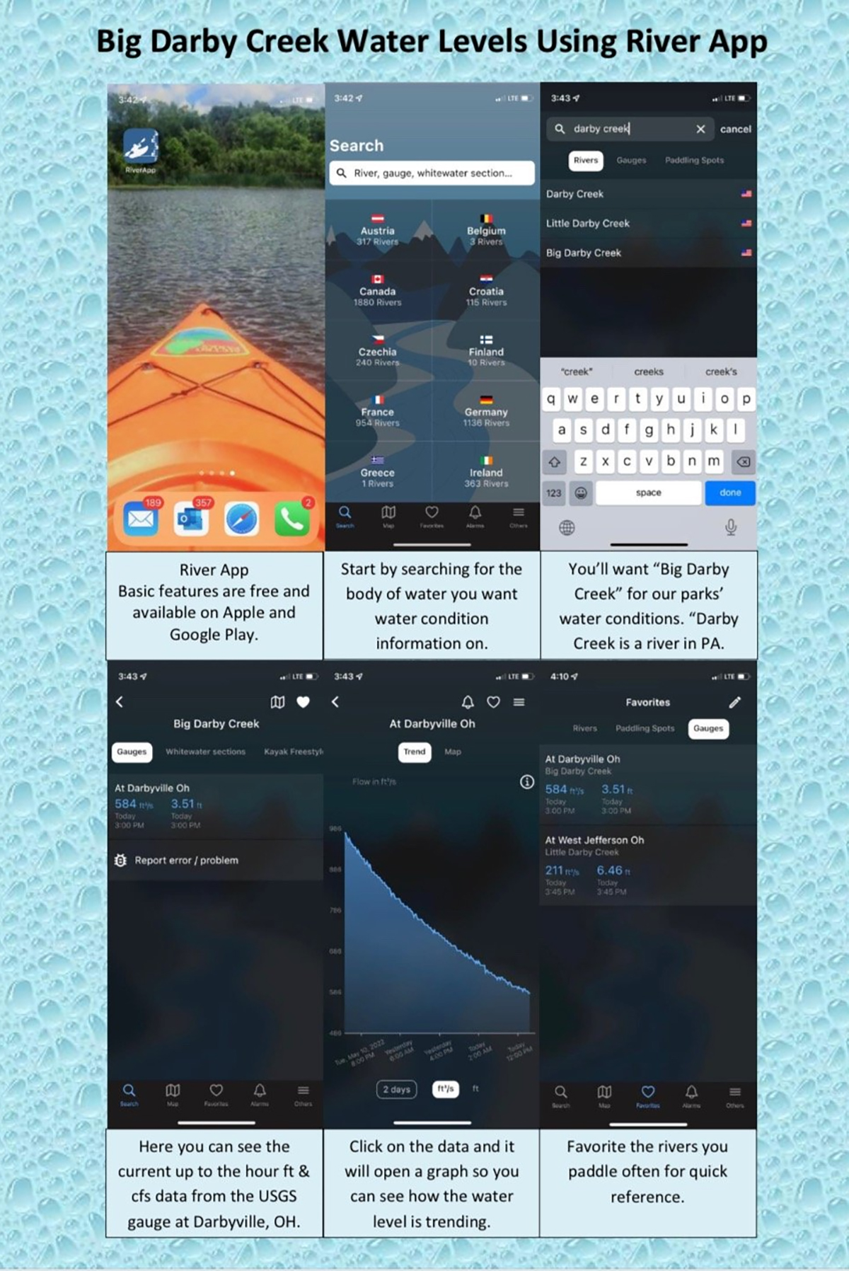 WATER LEVELS — Current water level conditions, read in feet (stream height) and/or cubic feet per second,cfs (streamflow), can be checked on many different outdoor and paddle apps or websites, all of which use the USGS gauge data. https://waterdata.usgs.gov/state/ohio/
