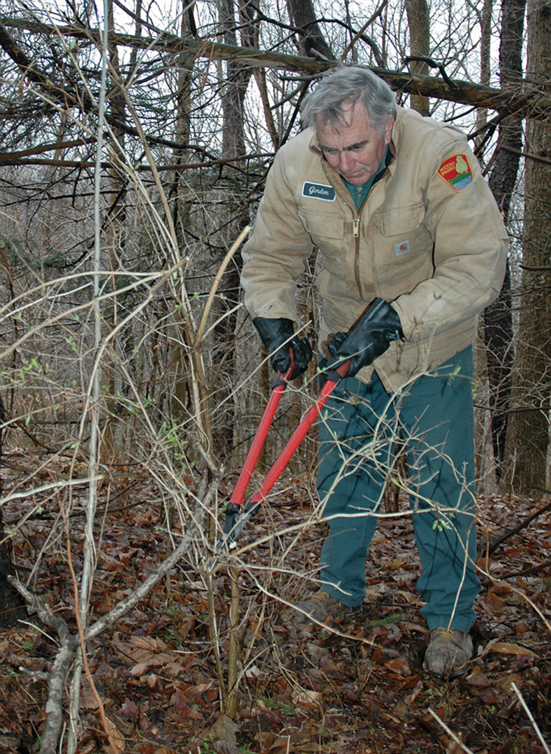 A resource management staffer cuts invasive honeysuckle at Sharon Woods.