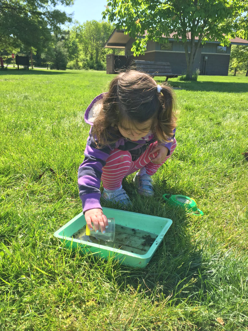 Nearly everyone’s been to a pond before. Maybe you’ve gone fishing, watched ducks, enjoyed a picnic nearby, or watched a scenic sunset from a dock or bench near the water’s edge. But have you thought much about what you might find UNDER the water? Our naturalists at Blendon Woods did some pond studies recently to see what they could find. We used small aquarium nets and trays to scoop up water and algae, and anything that came up with it! We also used “two way viewers” that magnify whatever you want to look at from both the top and the bottom.