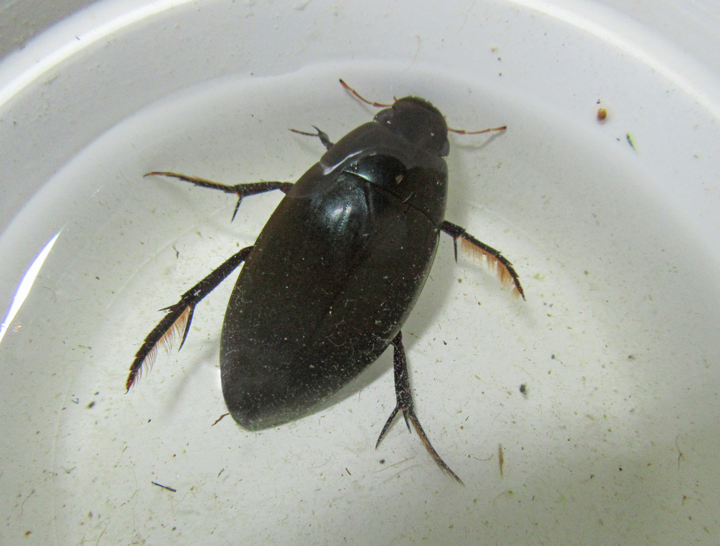 We found an impressive water scavenger beetle, about 2-inches long, which swam very fast through the water and algae. Their hind legs have hairs on them, which help the beetle to swim so well. They alternate legs when swimming, giving the appearance of rowing. We found other beetles too, with interesting names like whirligig, predacious diving, crawling and water scavenger.