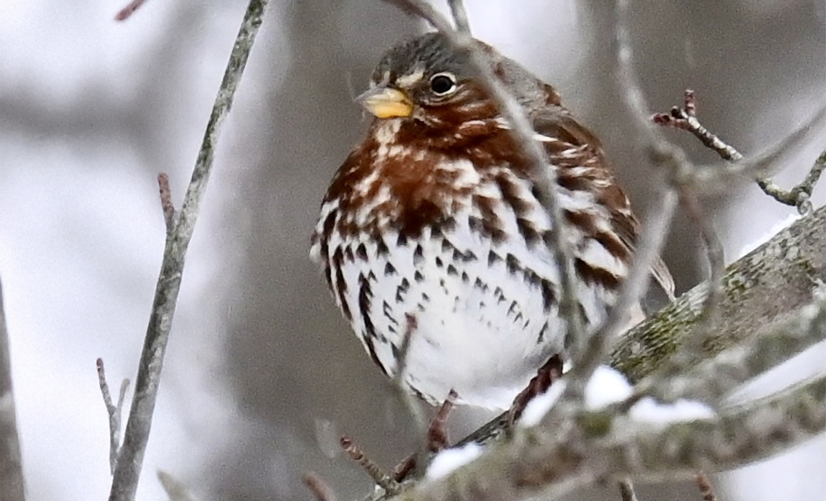 Fox sparrows are large and chunky for a sparrow and have a unique rusty-red and gray coloration with heavy streaking across the breast. This sparrow primarily breeds in the northern forests of Canada and Alaska during summer, but spends its winters south of the border. Some of these individuals will choose to spend the winter right here in Ohio. They forage on the ground using a distinct hopping-scratching method to look for seeds buried in the leaf litter. Look for this sparrow hopping and scratching under shrubs on the edge of forests or underneath bird feeders.