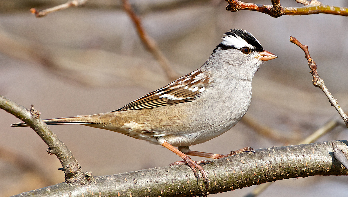 In the eastern United States, white-crowned sparrows are primarily winter visitors. This large, gray sparrow has a long tail and a remarkable head. It often looks as if the bird is wearing a black and white striped helmet. Juvenile white-crowned sparrows have the same pattern on their head, but the stripes are brown and gray instead of black and white. Look for this sparrow in overgrown fields and along roadsides. It can also be found foraging on the ground near bird feeders.