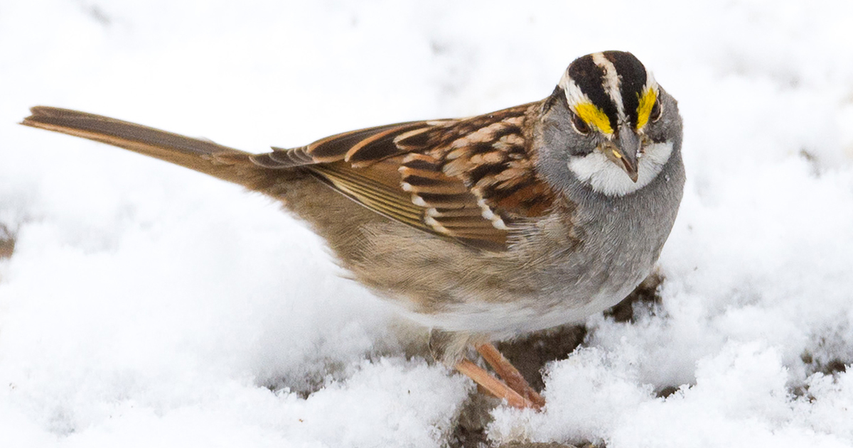 Often confused with the white-crowned sparrow, this winter sparrow has similar striping along the head. One key difference is that white-throated sparrows have yellow lores, or bright patches of color near the eyes. While many birds do not sing in winter, you can often hear the soft song of white-throated sparrows as they sing oh-sweet-Canada. This is a sparrow that readily visits bird feeders, where they can be found feeding on the ground. They are also commonly found in forests and edge habitats, where they will search for seeds in the leaf litter.